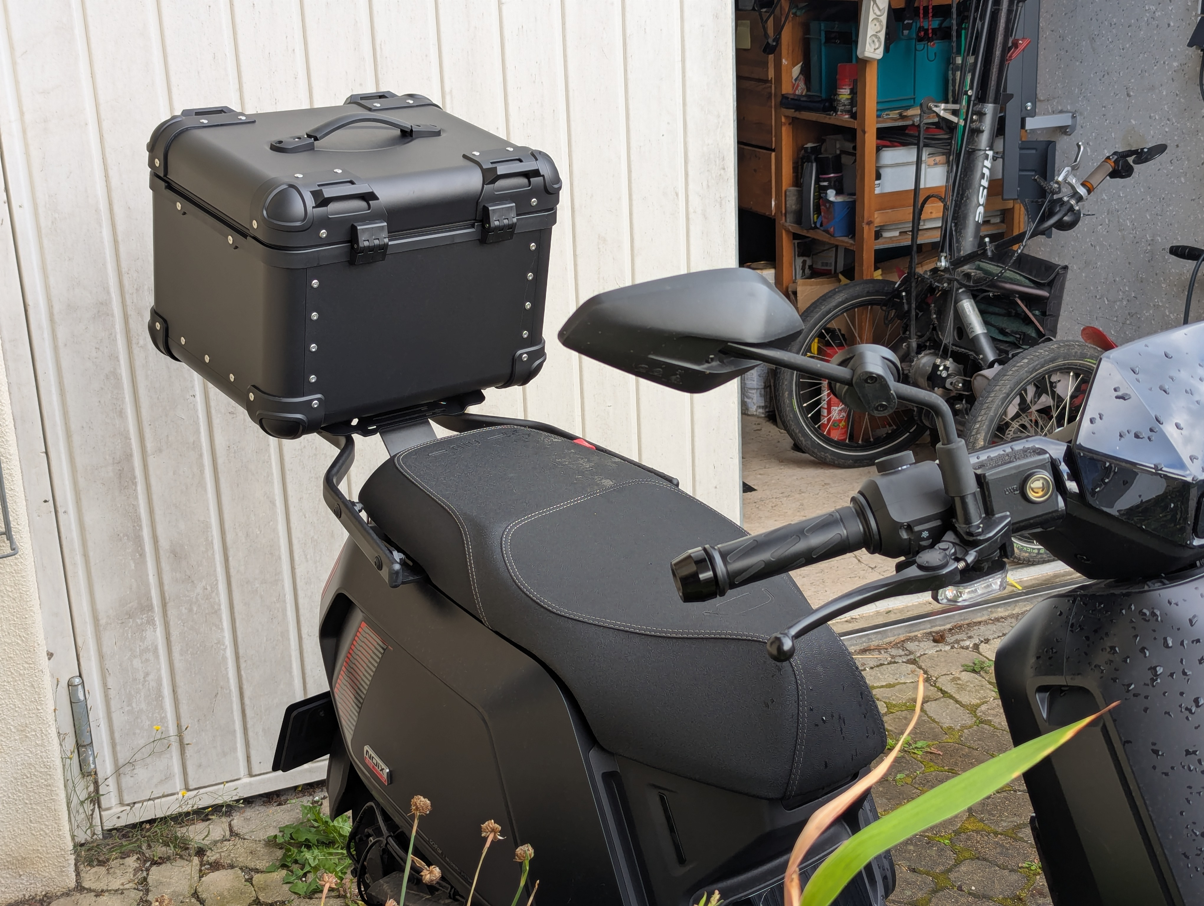 Nur der Träger: andere Seite: montierter Koffer: andere Seite: Helm passt rein: Träger ist der Niu/Givi von Voltsangels, Koffer ist der XS45 black von Motea. Und ja, der Polstereinsatz stinkt noch kräftig nach chinesischer Chemie. Ansonsten macht der Koffer einen ordentlichen Eindruck - die Ecken gehen nicht durch, sondern sind ausgespart (d.h. die Form ist nicht tiefgezogen sondern aus einer Platte gebogen), die Kunststoffeinsätze sind mit irgendwas Sikaflex-ähnlichem (von innen sichtbar) eingeklebt und vernietet.