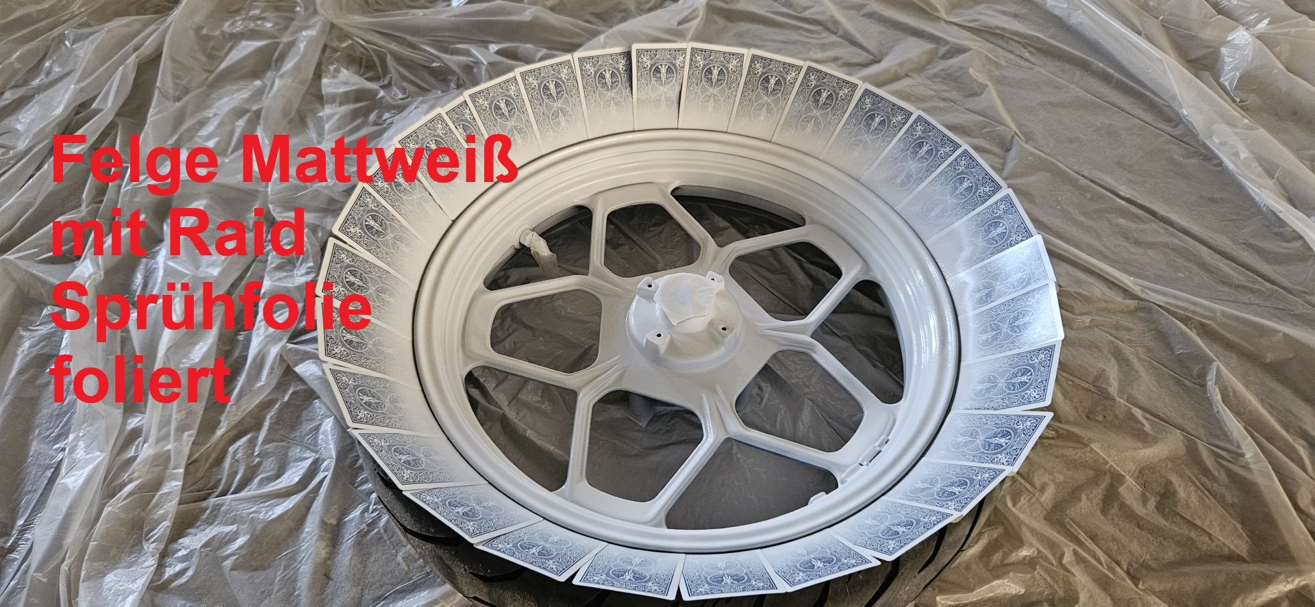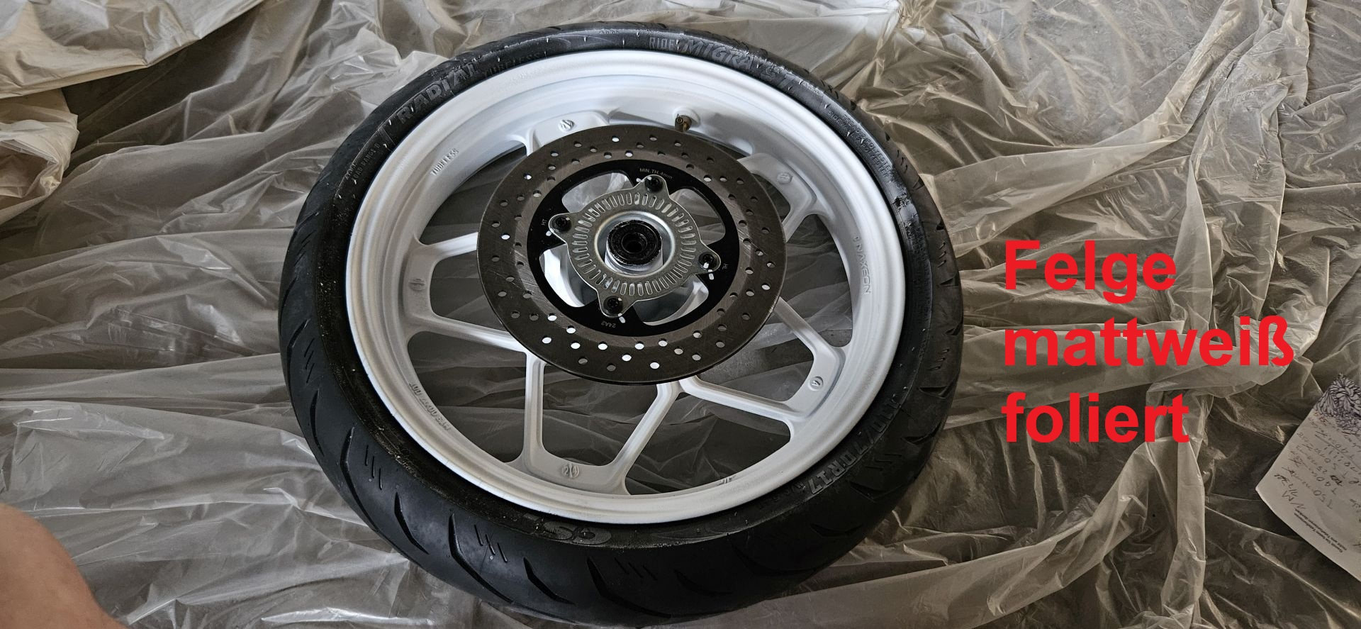 Ich habe mich bewusst für eine nicht haftende Einfärbemöglichkeit entschieden da ich zunächst testen wollte ob mir eine weiße Felge ohne Cover überhaupt gefällt / zum weißen Motorrad passt.
