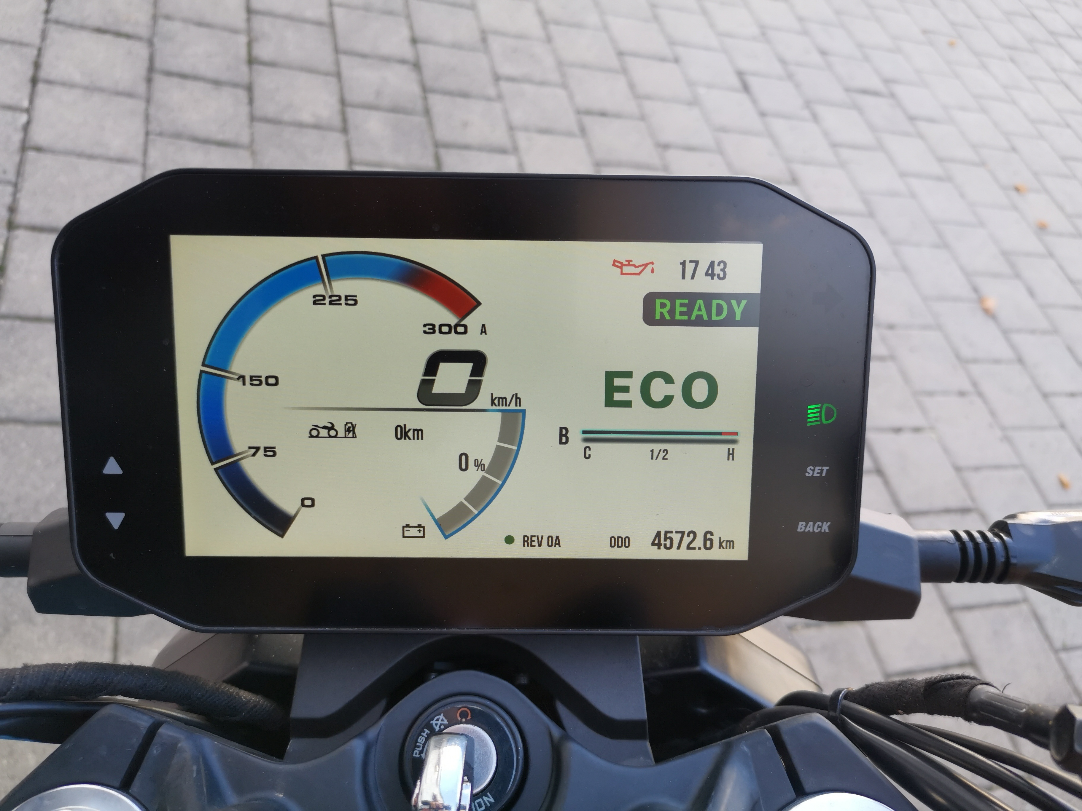 Nach 4.500 km gibt's nun auch bei mir, ich sage mal, Ungereimtheiten. Dieses Bild habe ich zeitweise beim Laden der Maschine und auch wenn ich sie anschalte zum Fahren. Es geht erst weg, wenn ich mit niedriger Geschwindigkeit fahre. Natürlich hat der Akku keine 0%. Am tollsten war es am Freitag, als ich von der Arbeit heim fuhr. Da hatte ich diesen Bildschirm während der ganzen Fahrt. 40km lang. Erst als ich bei mir anhielt und wieder langsam vor und zurück fuhr, ging er weg auf den normalen Bildschirm.