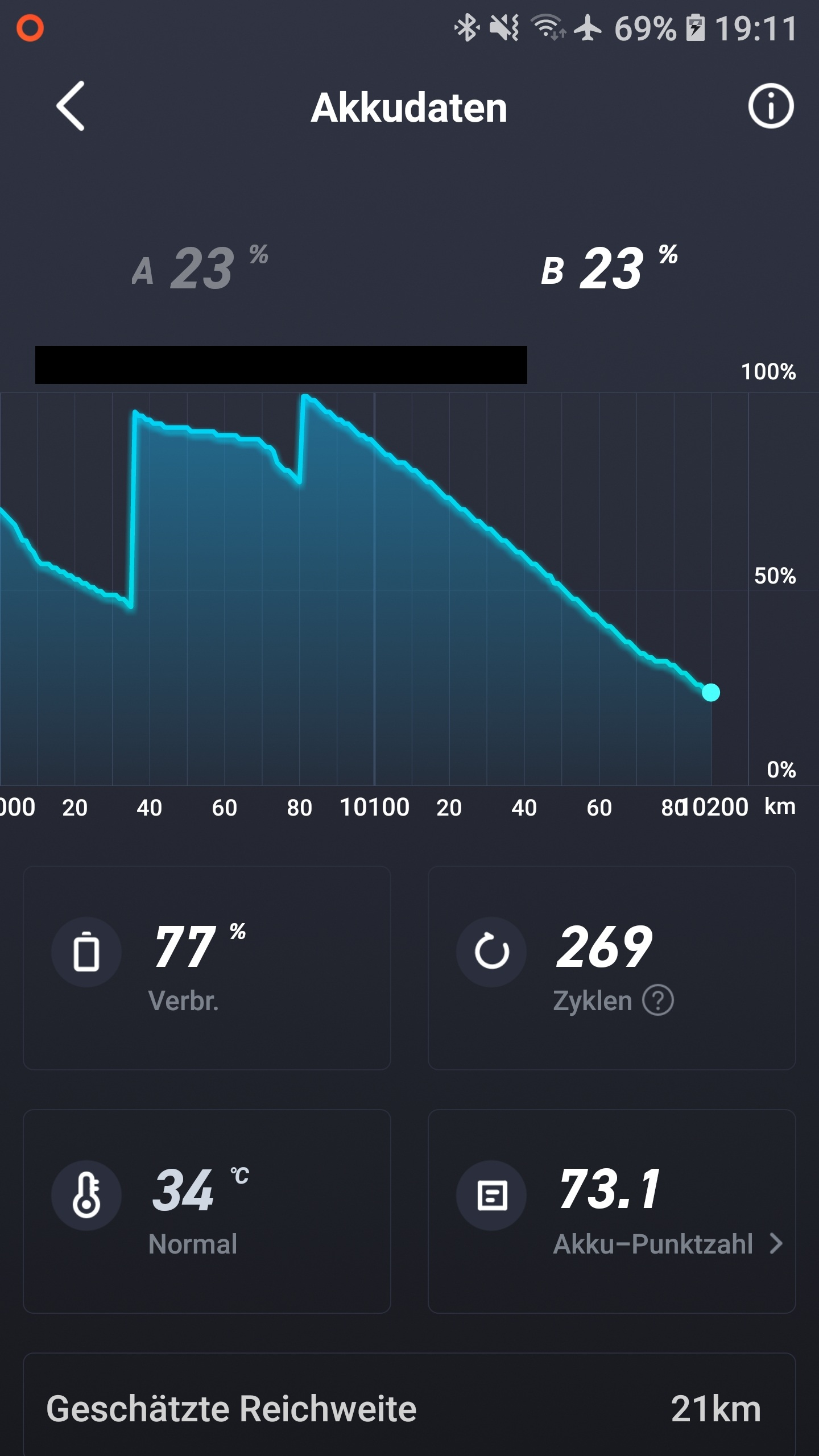 Die Akkus müssen noch nicht in Ruhestand, aber evtl. Altersteilzeit. Laut App reichen sie noch für 90 km. Im Mai bin ich mal 75 km (netto +260 Höhenmeter) am Stück gefahren und zuhause auf der Einfahrt hat der Akku dann bei 14% in Safe-Mode geschaltet. Aber für den Alltag noch lange brauchbar.