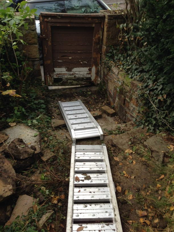 Roller in der "Garage": Klappe zu: Die provisorische Rampe (wird von einem Gartenbauer noch richtig gemacht: Gruß