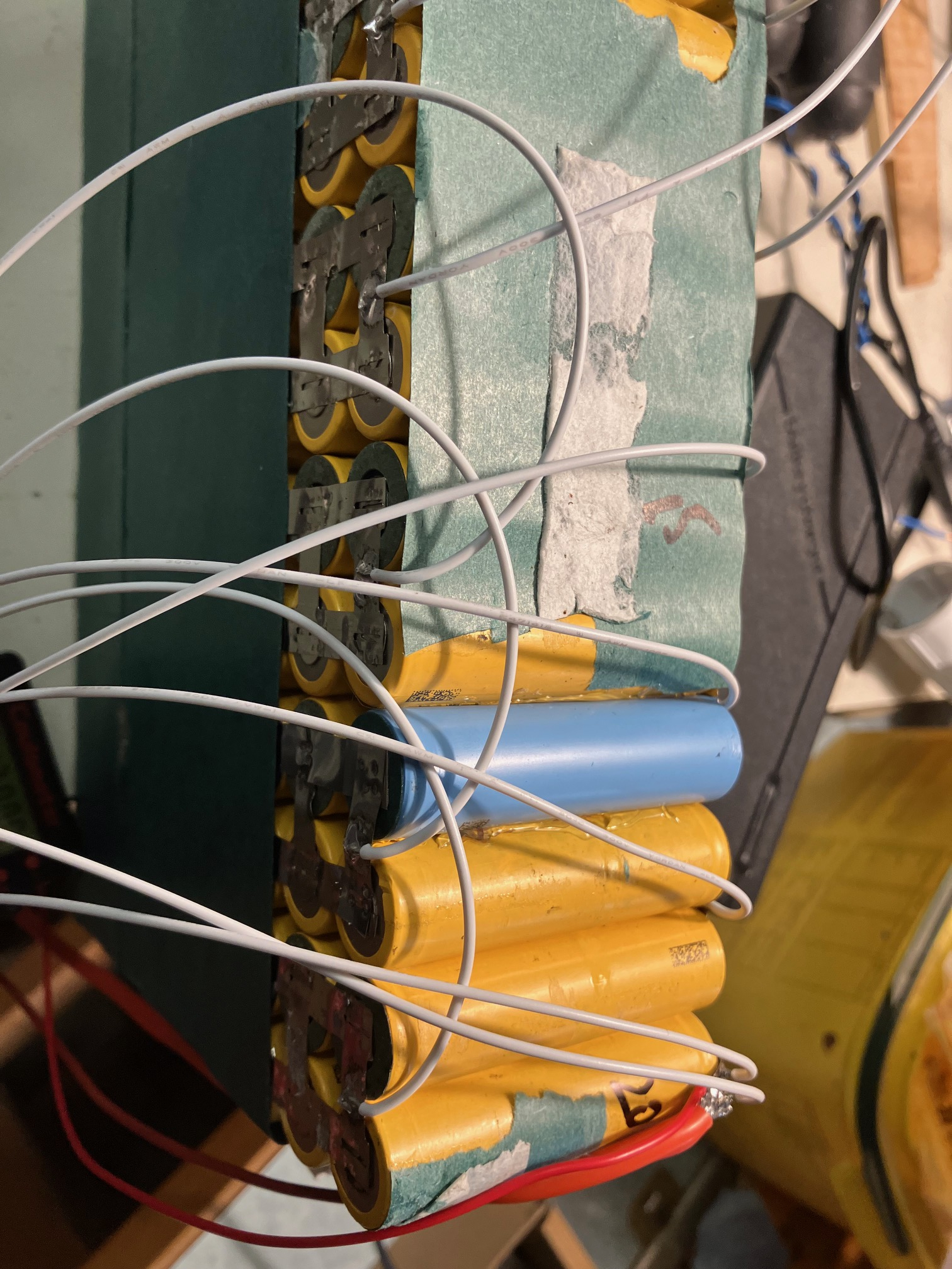 Die Nickelstreifen und Schweißpunkte sehen eigentümlich aus,wie falsch behandelt. Die Pole B+ und B- hängen an einer kurzen Fahne - dann kann man sich die ganzen Verbindungen der Zellen im Gitternetz gleich sparen, wenn der gesamte Akkustrom über ein Nickelband läuft.