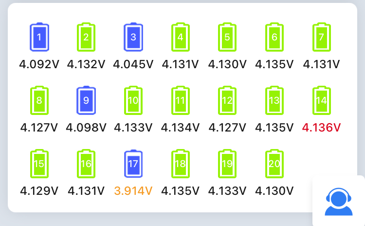 19 Stränge liegen zwischen 4,09V-4,15V, Strang Nr. 17 ist tot.