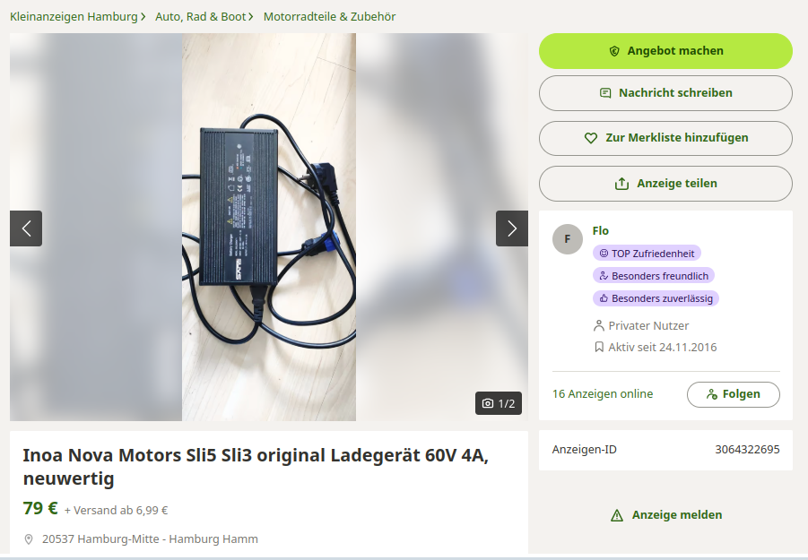 Inoa S5-Li + 2. Akku + 2 Ladegeräte mit je 7A => Original 4A-Lader verkauft. 11/2023 12A China-Ladegerät gekauft und umgebaut. Seit 11/2022 Tuning-Controller verbaut. Windschild (empfehlenswert) seit 03/2022. Gesamtpreis per 01/2022: 2.930 €.