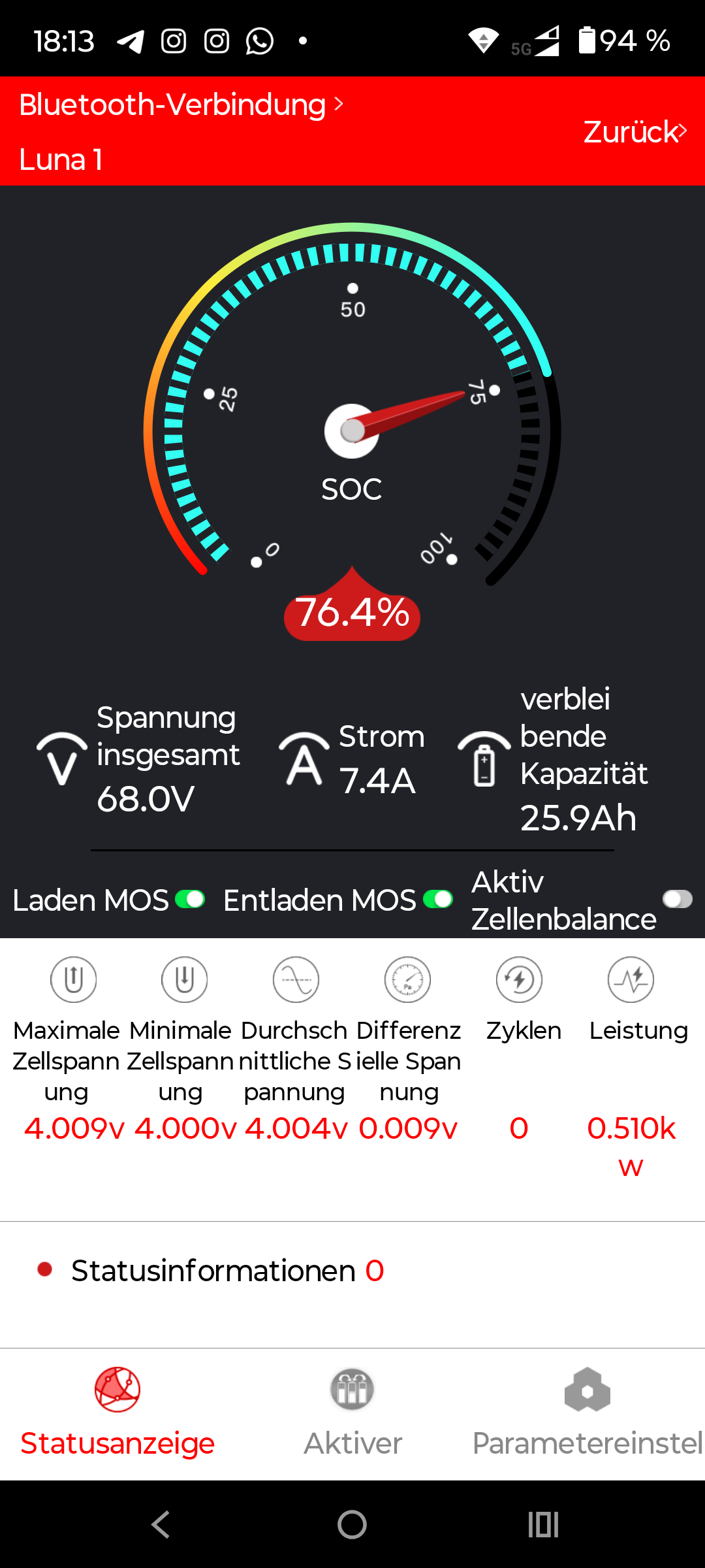 Allerdings habe ich im Alltag die App selten genutzt - ich kontrolliere nur gelegentlich die Zellsoannungen und ihre Differenzen. Wann man laden muss, weiß man recht schnell.