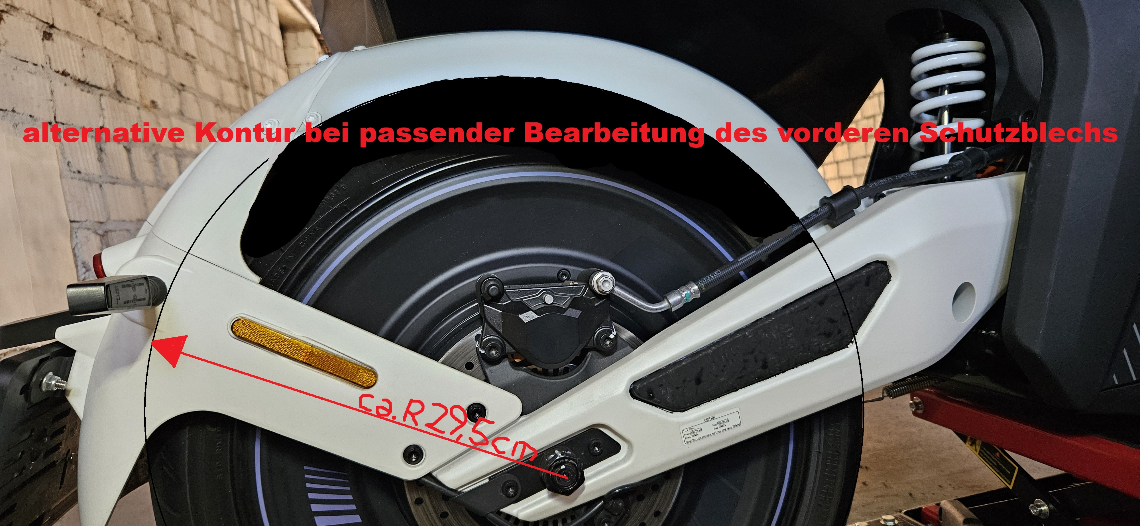 Wenn man eine "schlichtere" Version verbauen möchte lässt sich mithilfe eines Maßbands oder Zirkels (eingestellt auf Radius ca. 29,5cm bezogen auf die Radachse) auch eine kreisrunde Kontur auf das Schutzblech zeichnen und das hintere Schutzblech durch "Wegschneiden" anpassen womit es optisch erleichtert wird ohne das der Spritzschutz wesentlich verschlechtert wird.