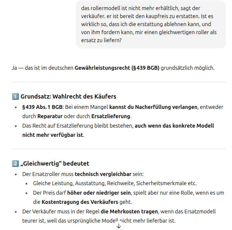 Also, jetzt habe ich wegen der Ablehnung der Kaufpreiserstattung nochmal die KI befragt, und die gibt dir (zu meiner Überraschung) sogar recht: