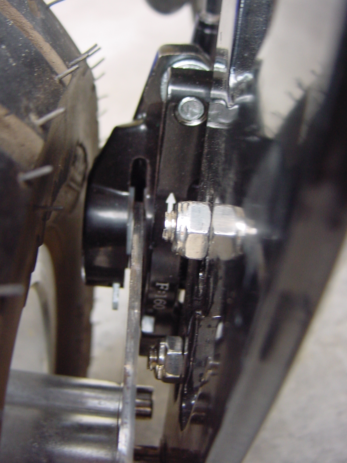 Ich habe es als wichtig empfunden, nicht die etwas zu weit nach außen abstehenden Gabelenden einfach zusammenzuspannen, sondern habe die Abstandshülsen des Vorderrads links und rechts mit passenden U-Scheiben aufgefüttert, so dass der Reifen zentral unterm Lenkrohr steht. Rechts was dickeres: Links was dünnes: 16. Controller-Trennblech und Batterie wieder im Batteriekasten deponieren