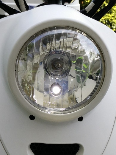 Zum Birnenwechsel muss man auf der Innenseite der Beinverkleidung die beiden oberen Schrauben (Kreuzschlitz) rausschrauben. Dann das UNU-Logo auf der Frontseite aufklappen und die Schraube darunter lösen (10 er Nuss). Dann von unten nach oben mit etwas Druck (beim ersten Mal hat man Angst den Plastik zu beschädigen) nach oben raus drücken. Anschliessend hat man den Scheinwerfer mit Plastikblende in der Hand. Der Rest ist einfach. Standlichtlampe ist einfach mit Gummi in den Reflektor eingebracht.