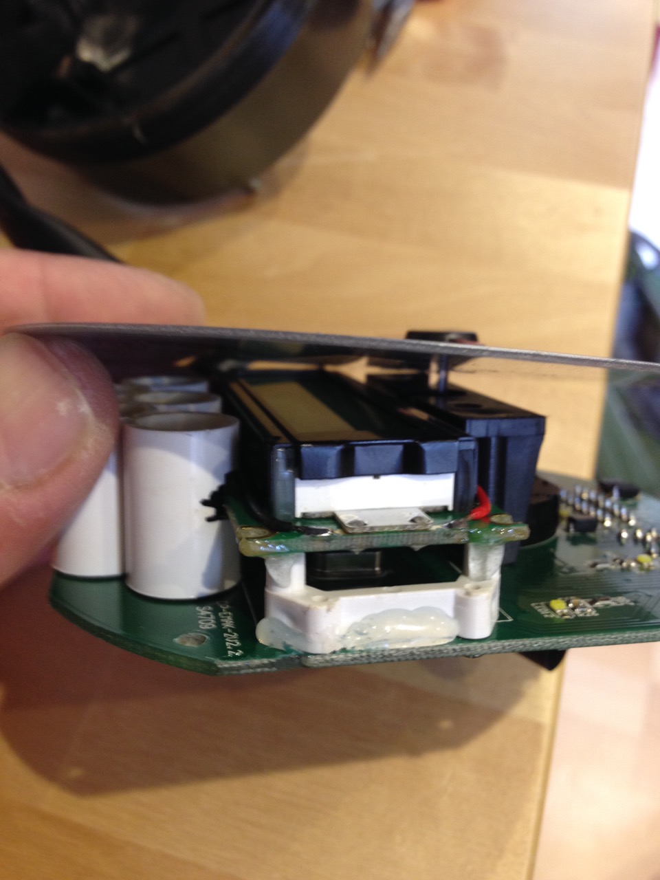 Das neue Display ist von den Abmessungen etwas anders, so passten die Befestigungsbohrungen nicht, also habe ich sie mit Uhu Plus verklebt. Die Plastik-Lichtführungen der LEDs passten auch nicht mehr richtig und mussten etwas ausgefräst werden.