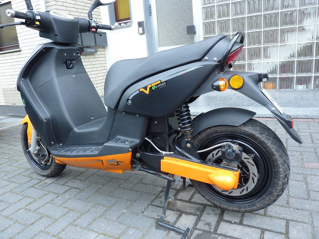 2011 waren die schwarz-orangenen mit Sevcon-Controller size 4 ( Das Helmfach wurde horizontal abgeschnitten und ein neues Unterteil angeschraubt, damit der Sevcon 'reinpaßt). Vorne wurde er mit einer 240mm Bremsscheibe ausgerüstet - Nachteil man muß zum Bremsbelagwechsel das Vorderrad ausbauen. Hinten blieb es bei der 190er Bremsscheibe.