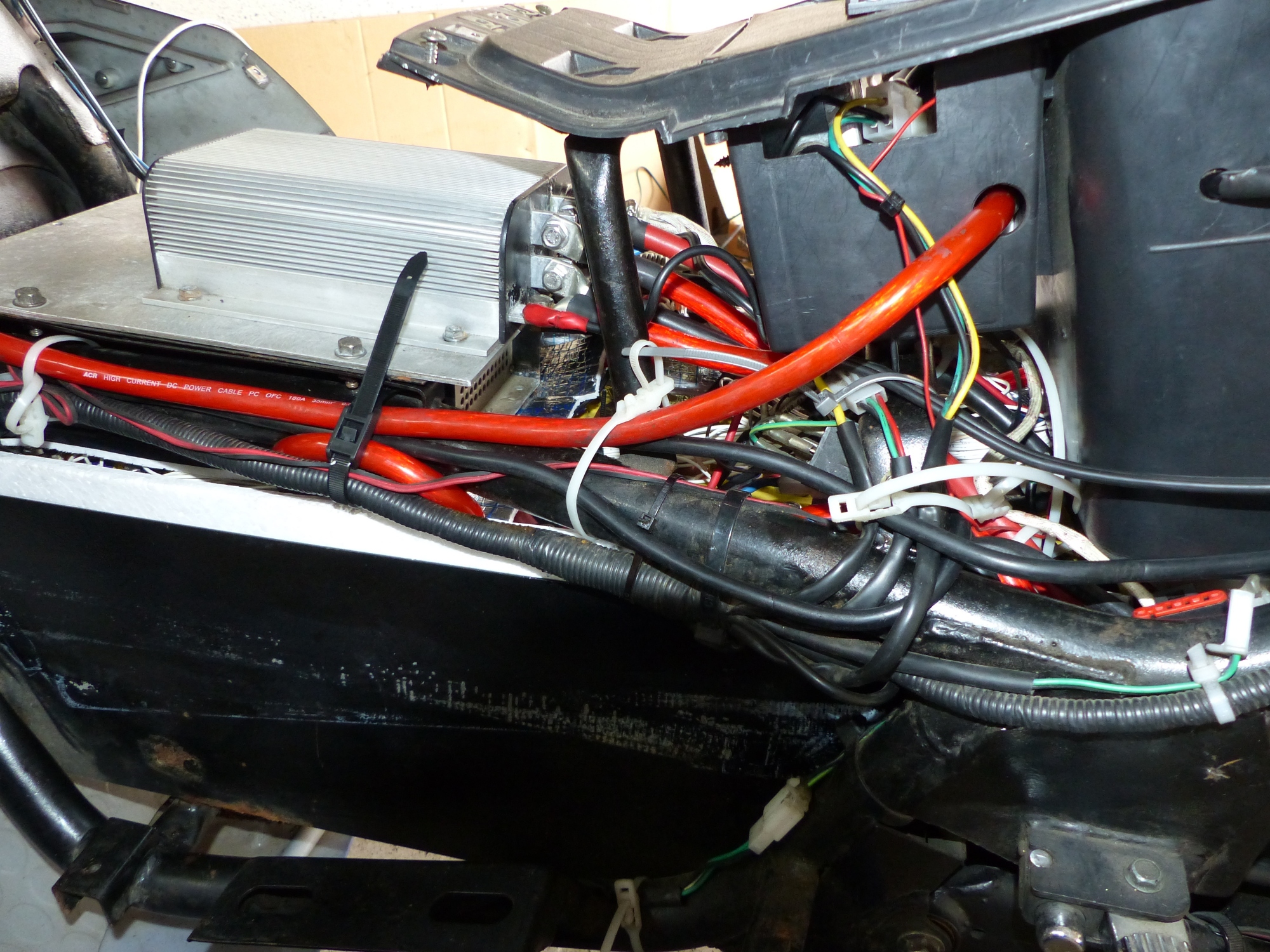 Hier noch ein Bild von den 35mm² Phasenkabeln am Controller. Und wie bei allen anderen Presskabelschuhen die Pressverbindungen von Hand gemacht, z.T. mit vollem Körpereinsatz. Der restliche Kabelsalat ist nicht besser wie früher, musste aber auch wieder komplett angeschlossen und mit Kabelbindern fixiert werden, bevor das so aussah: