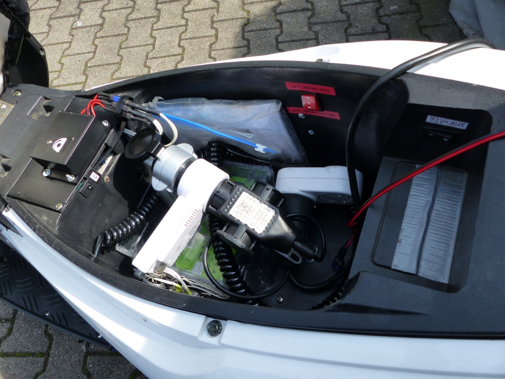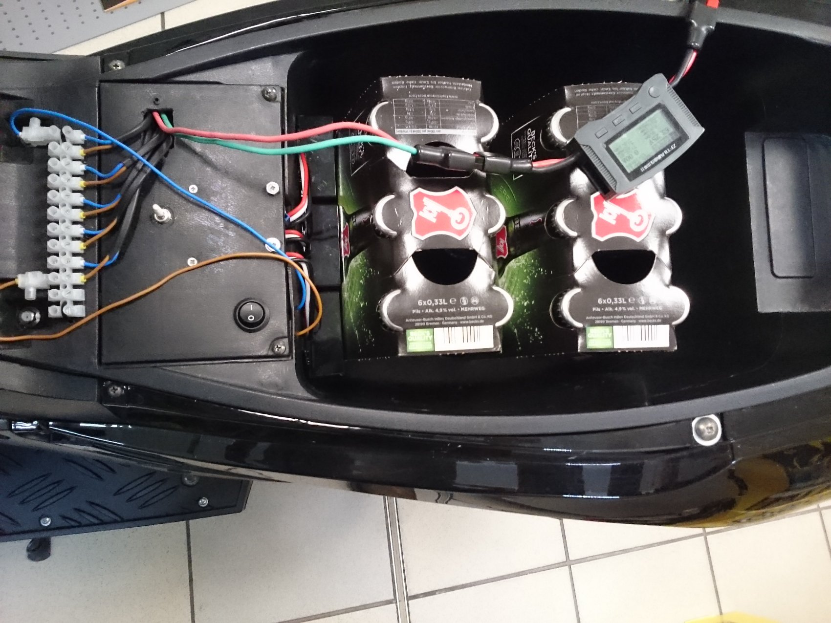 Hier ist der vordere Teil des Helmfachs von oben, mit dem Thermostaten auf dem "Batteriefach"deckel und seinen Zuleitungen, für die ich mir noch eine gescheite Befestigung ausdenken muss. Ich hätte wohl die Kabel aus dem Thermostaten heraus etwas länger machen müssen... Das BMS unten im Helmfach ist noch nicht ganz angeschlossen und auch noch nicht abgedeckt. Ebenfalls zu sehen ist das zu kurze Netzkabel vom Schaltnetzteil mit dem weißen Schuko-Stecker dran.