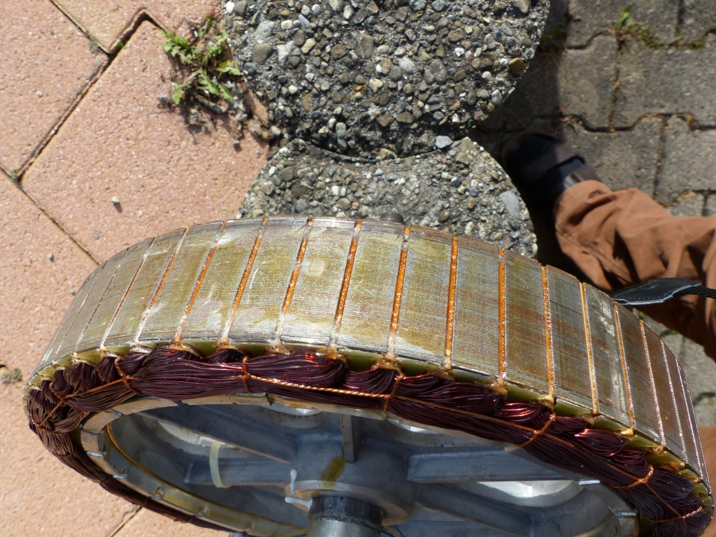 Das sind sicher 30 Lackdrähtchen pro Phase, und scheinbar nur 2,5 Windungen pro Polschuh :o Das aber mal 21 auf den Umfang verteilt, und sich abstoßend und anziehend an nicht besonders kräftigem, aber ebenfalls auf dem ganzen Umfang verteilten Magneten, erzeugt bei meinen 100A Batteriestrom beim Anfahren mal kurz 160 bis 180Nm am Reifen :mrgreen: