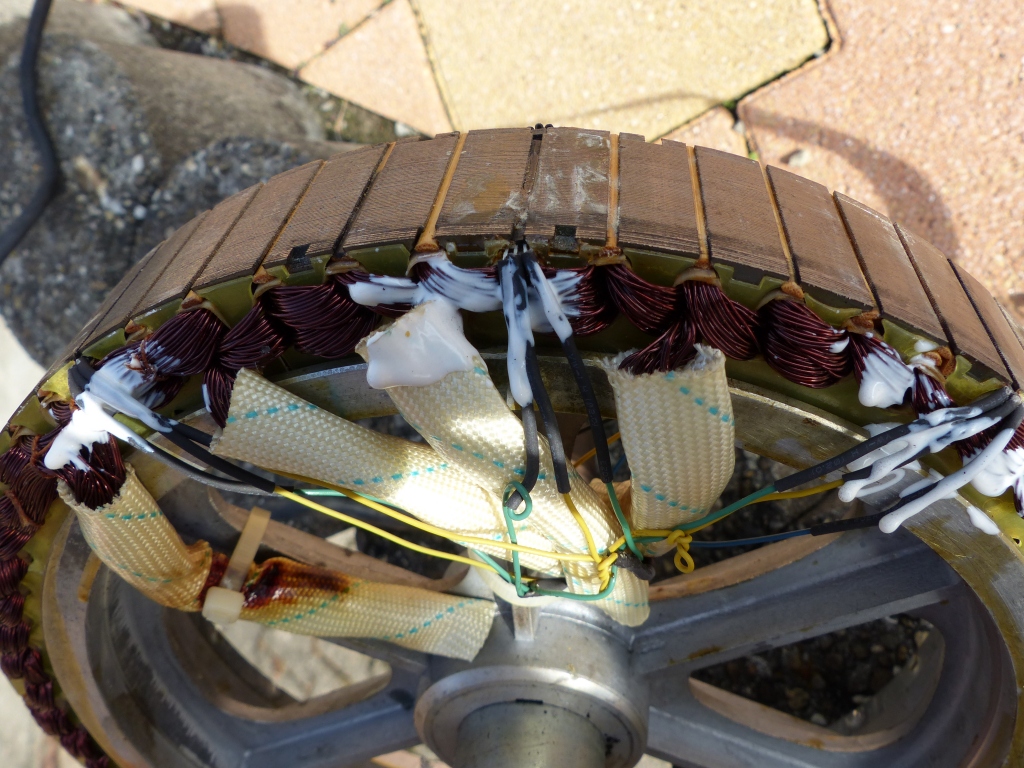 Die dünnen Drähte gehen zum zweiten dreier-Satz von Hallschaltern, die drei Textilhüllen rechts im Bild verbergen die drei Phasen-Litzenbündel, und die fette Textilhülle links mit der brauen überhitzungsverfärbung verbirgt den Sternpunkt, wo alle drei Phasen-Litzenbündel zusammenkommen und miteinander leitend verbunden sind.