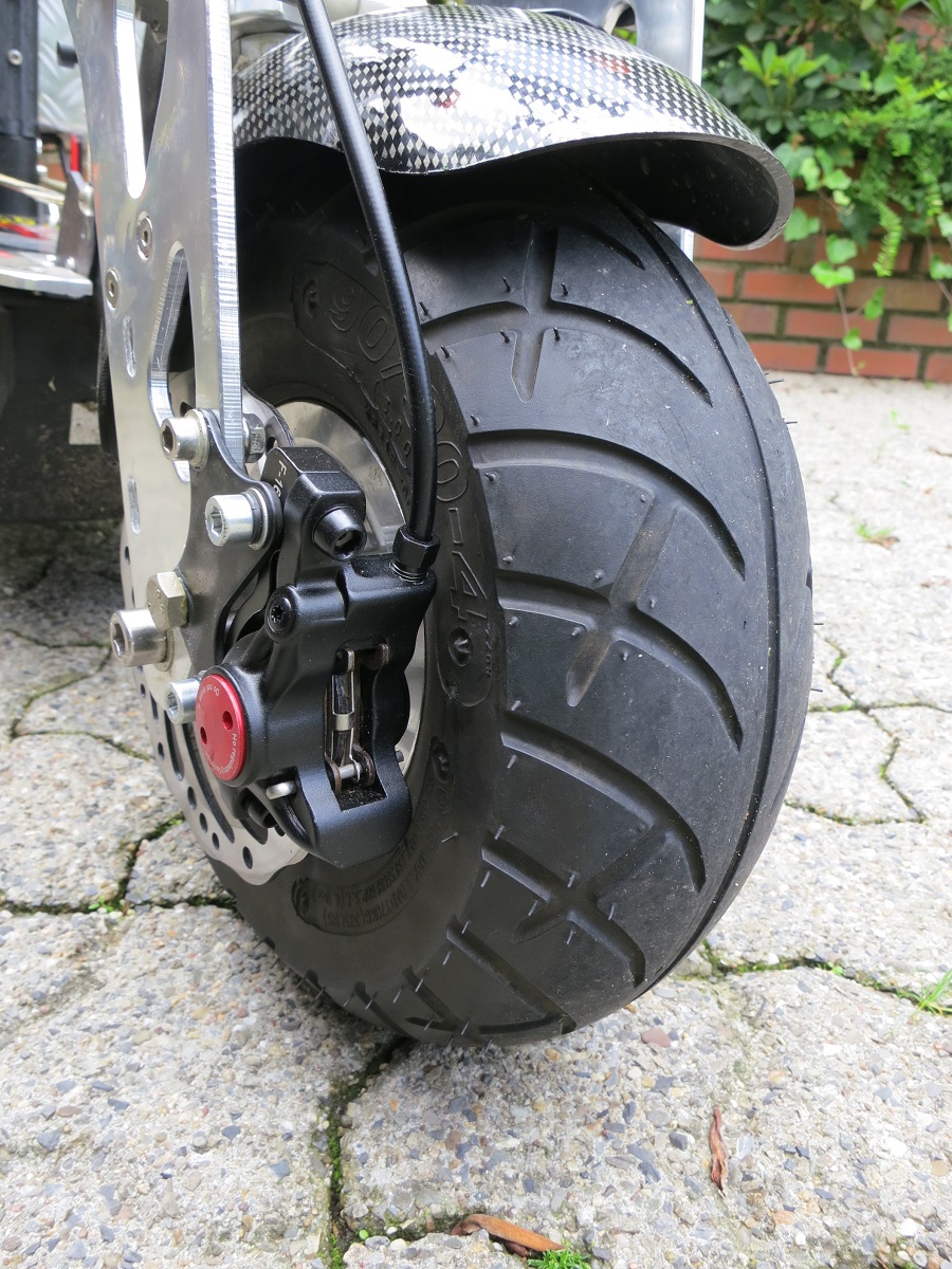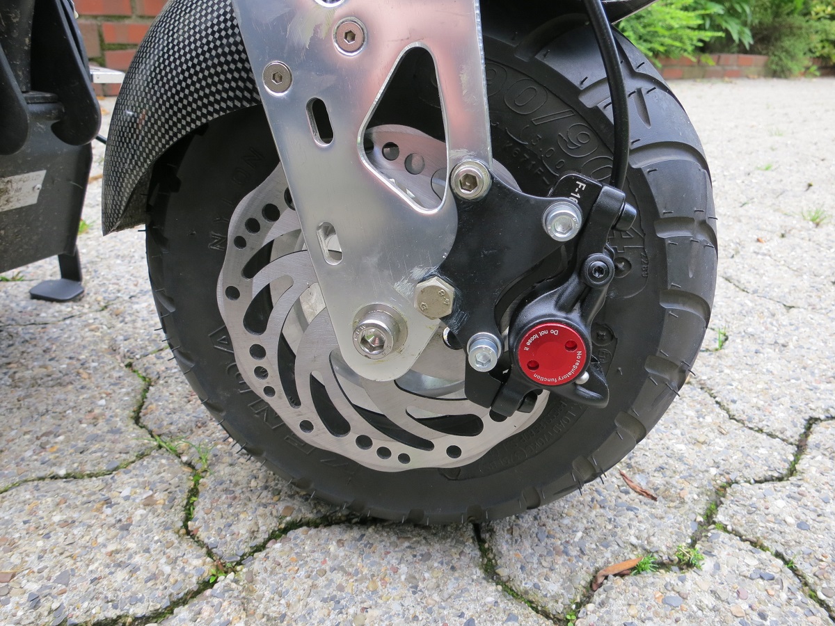 Die 4“ Räder sind etwas klein für die Bremsen und zum Reifengummi bleibt nur 1 bis 2mm Luft. Beim Vorderrad ist zu allem Übel auch noch das Schutzblech für den Hydraulikschlauch im Weg.
