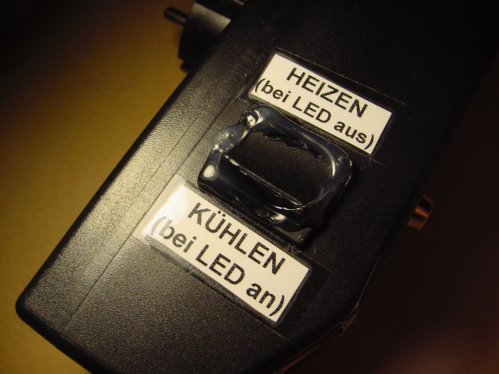 Ich weiß schon, warum das eigentlich ein versenkter Schiebeschalter hätte sein sollen, doch leider war kein Platz im Gehäuse für einen mit der nötigen Schaltleistung... Nun ist der Kippschalter per umlaufender Heißkleberaupe in Stellung "HEIZEN" fixiert :twisted: