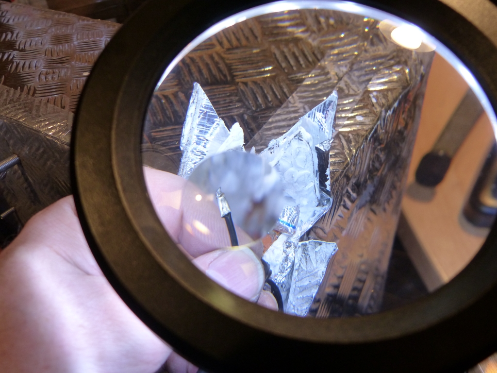 Zum Schluss alle offenen Kanten wieder mit Alu-Klebstreifen abgedichtet und nochmals den Gesamtwiderstand der wieder 4 parallelgeschalteten Heizmatten gemessen: 2,5 Ohm = i.O., keine Wackler mehr beim Schwenken des Anschlusskabels. Noch von 23 bis knapp vor 24 Uhr am Thunder draußen die Heizung getestet => alle vier Seitenwände sind wieder warm geworden