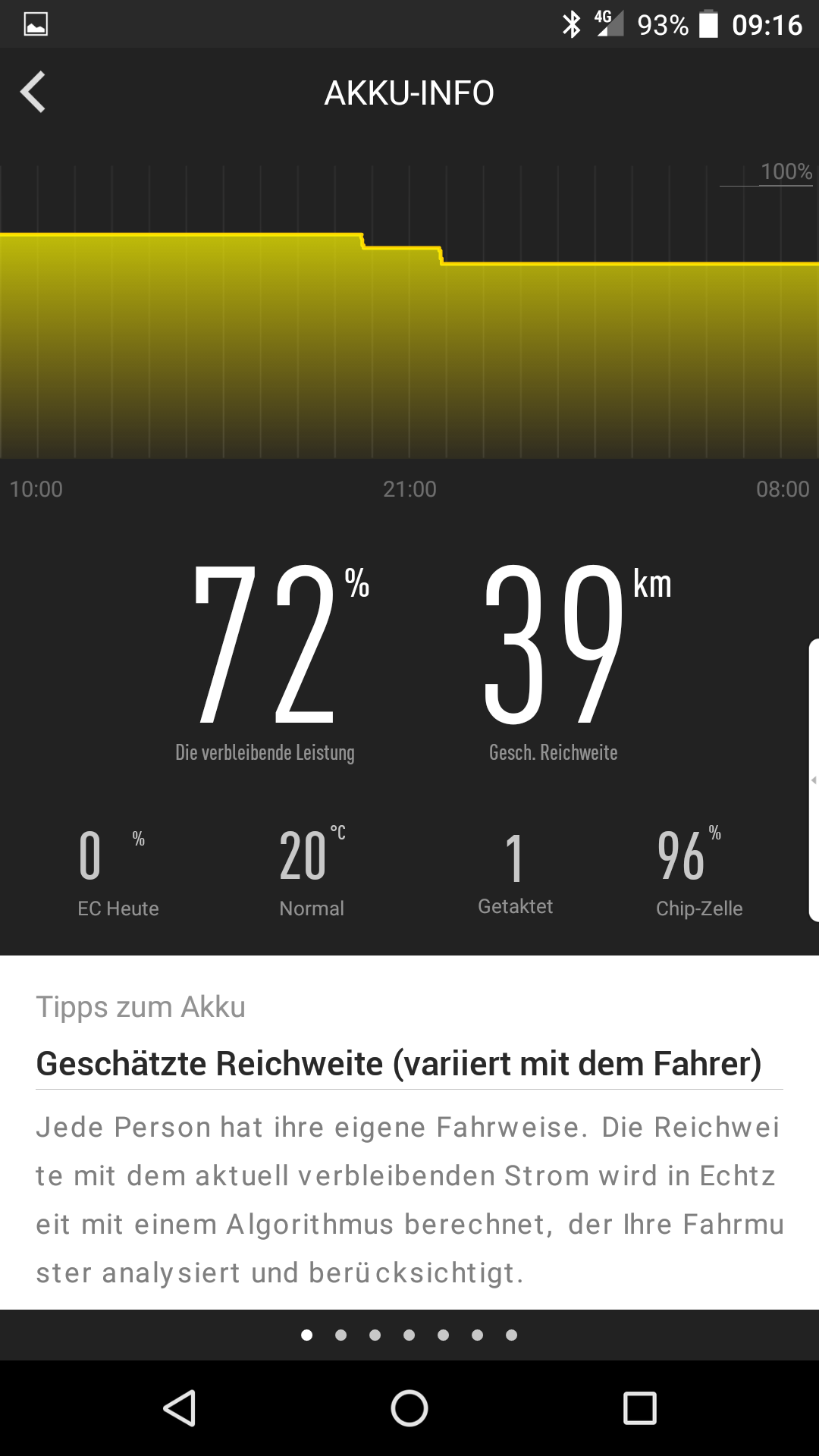 Zu den Fotos: die geschätzte Reichweite der App ist nach unserer kleinen Bergfahrt zu zweit natürlich nicht representativ. Der Indikator für die Batteriegesundheit (Chip-Zelle) ist bei 96 Prozent, weil dieser erst nach 3 Aufladevorgängen (Vollzyklen) kalibriert ist.