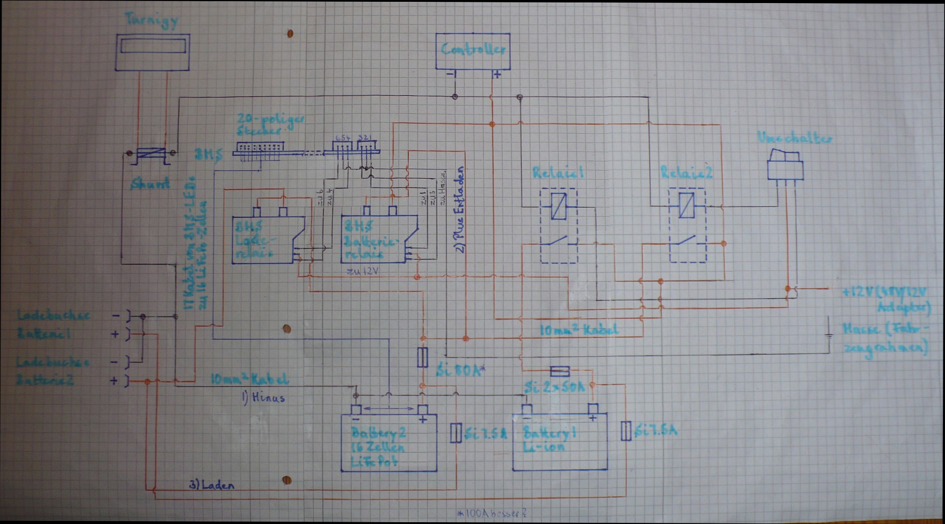 Ich hab' versucht, mich im Bezug auf die Funktionsweise eines Batterie-Trennrelais etwas schlau zu machen (mit Suchbegriffen wie "Funktion eines Batterie-Trennrelais", "Funktion eines 12V/120A Trennrelais" oder "Schaltplan 12V/120A Batterie-Trennrelais"), aber im Grunde nichts gefunden, was mir dabei hilft, Deinen V1/V2-Schaltplan so fertigzustellen, dass ich nicht nur mit dem 6A-Schalter eine Batterie (wenn sie leer ist) sowie das Turnigy auf die andere umschalten kann, sondern auch das LiFePo-BMS "einbinden" kann. Sämtliche Onlineartikel über Batterie-Trennrelais, die ich gegoogled habe, beziehen sich alle nur auf den Einbau von Trennrelais im KFZ oder Wohnwagenbereich, wo 2 Batterien (eine Starter- und eine Versorgungsbatterie) entweder getrennt oder miteinander verbunden werden sollen. Und Conrad Electronic anrufen brachte auch nichts, da der Techniker mir entweder nicht sagen wollte oder konnte, ob es im Prinzip möglich ist, zwei Trennrelais hintereinander, also in Reihe, zu schalten bzw. 4 Trennrelais in einer Schaltung zu haben :x.