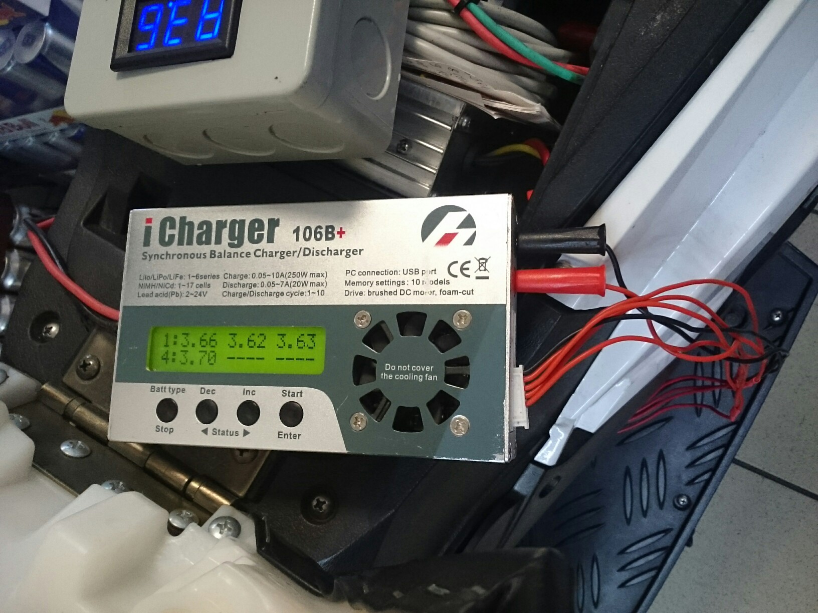 Jetzt muss noch die Entladung einzelner Zellen gebremst werden (Lipoblitzer einzeln oder mehrere Packs?) - weil der Controller möglicherweise einzelne Zellen zu leer werden lässt, bevor er abschaltet bzw. Warnleuchte angeht (?).