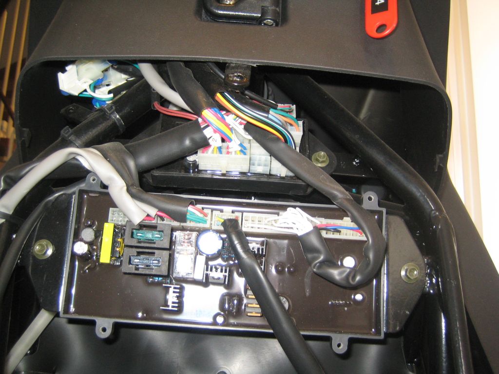 Der schwarz-orangene ? 2011 E-Max mit Sevcon Gen4 Controller hat die autark laufende MSU (ManagementSystemUnit) vorne zwischen den Rahmenrohren. Darüber ist noch ein Interface (Kabelsortierstecker). Die Batterie versorgt ja den Controller mit einem dicken roten +48V Kabel und einem dicken schwarzen 0V (Masse) Kabel. Unter den dicken Kabeln sind jeweils 2 dünnere 1mm² rote Kabel bzw. 2 dünnere 1mm² schwarze Kabel geklemmt, welche zur MSU laufen und diese über das Zündschloß? mit 48V versorgen. In der MSU der Blinkgeber sowie der DC DC Wandler 48V auf 12V für das Licht. Eine der beiden Sicherungen ist für das Licht (12V). Die dünneren weißen Kabel schließen wir einmal aus. Bei Licht AUS aber Roller AN wird es ein dickeres 1mm² rotes Kabel geben, welches die gewünschten 12V führt.
