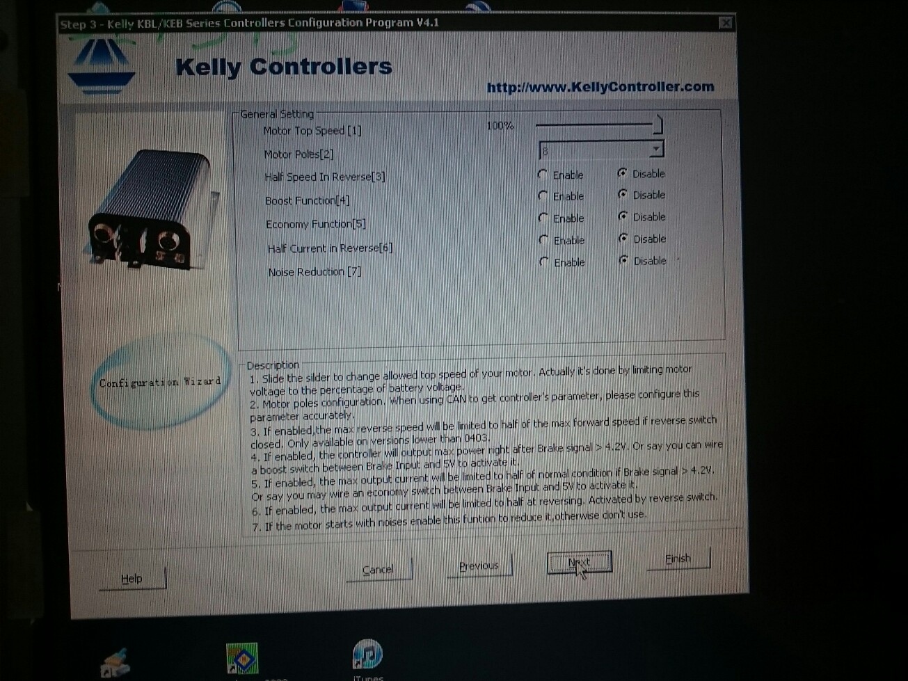 Probiere das mal mit auf 35% reduziert, das dürfte dann immer noch etwas über 120A aus der Batterie saugen lassen zwischen 35 und 55km/h, aber die Batterie kommt dann damit besser klar. Das musste ich vor kurzen auch mit meiner extrem hochohmigen Winston Batterie machen, aber ich musste im stärkeren Kelly auf 28% limitieren, um bei 120A zu begrenzen.