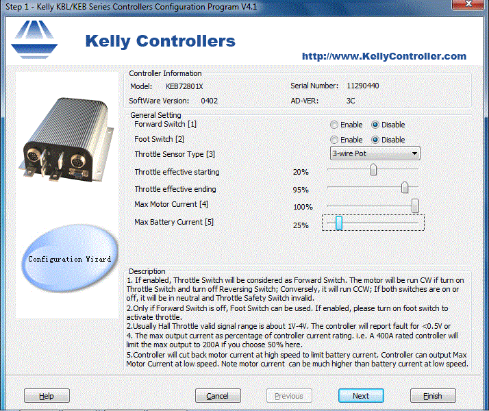 So, hier sind die letzten Einstelllungen, die mein KEB72801X drin hatte, und mit der alten Winston Batterie auf Betriebstemperatur (wichtig, >20°C!) maximal 100A Anfahrstrom und maximal 120...125A in der Spitze aus der Batterie in Richtung Motor schickte: