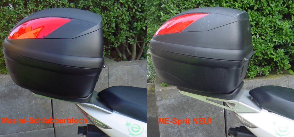 In dieser Form aus nur 2mm Blech ist das ein Schlabberbelch, ähnlich dem "Masini" Edelstahl-Gepäckträger für Thunder und Konsorten, den ich ursprünglich an meinem E-Pferdchen dran hatte- schlabber schlabber schlabber bei jeder Bodenwelle. Ist auf dem linken Teil dieses Bildes zu sehen. Rechts meine eigene verstärkte Variante, die zwar aufgrund der Anschraubgeometrie bei wüsten Bodenwellen immer noch leicht nachwippt, aber nicht mehr schlabbert: