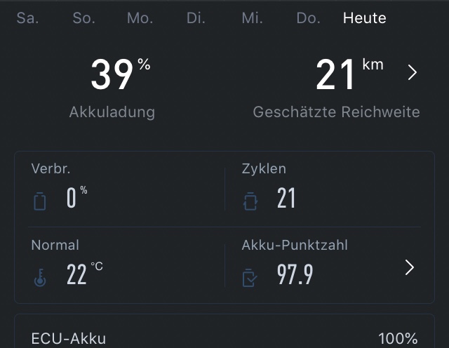 Habe genau das selbe Phänomen bei mir. Ein Strich bei dem Ladestand, keine Verbindung, aber wenn man auf die Details blickt sieht man wie voll die Batterie ist. Das ist eindeutig ein App Fehler. Die Verbindung zwischen Roller und Server besteht ja.