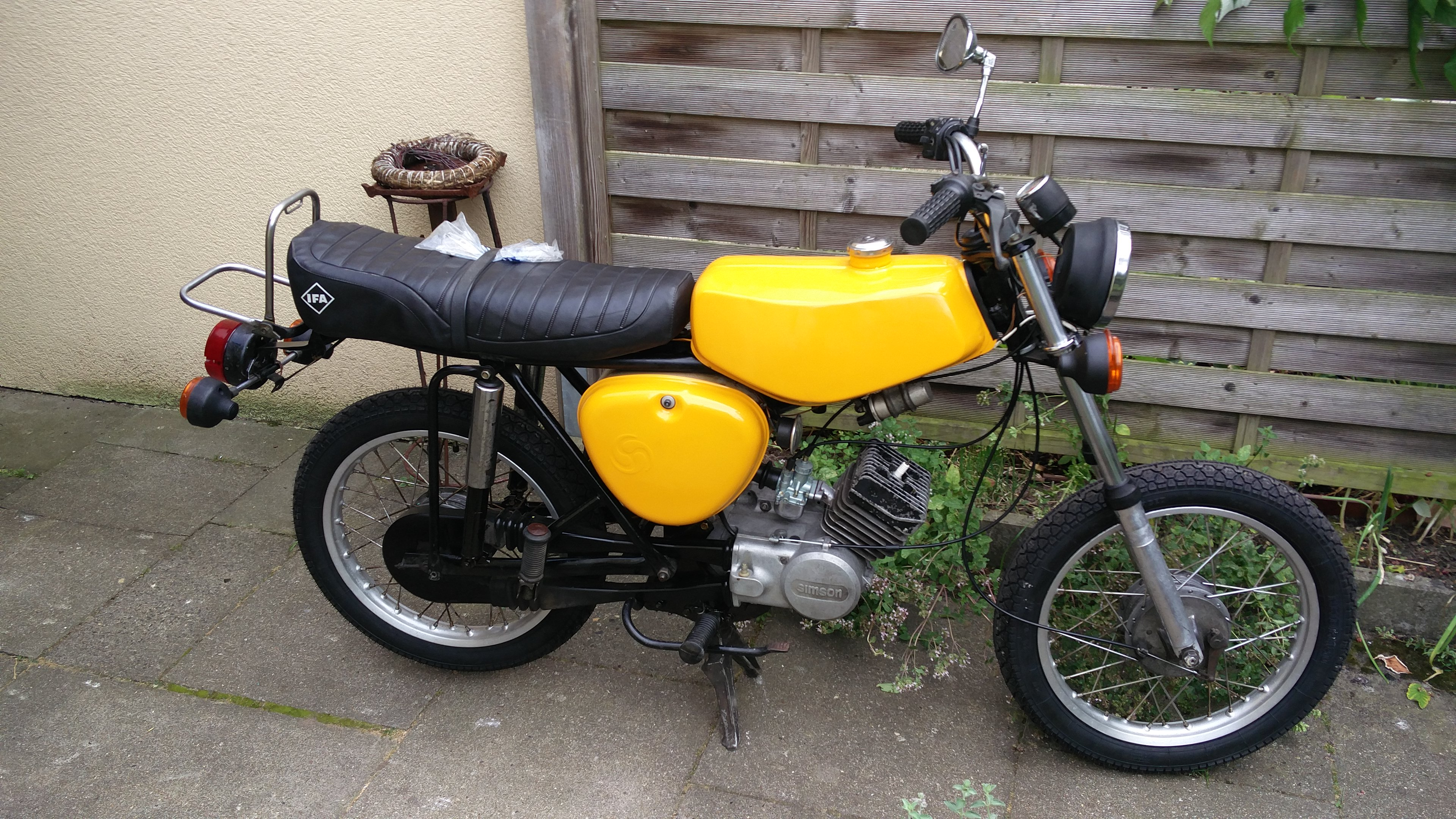 Die "böse" Simson ist auch fast wieder zusammen, Bremsen wieder einstellen und Tanken fehlt noch. 3 Blechteile frisch gepulvert, Tank von Innen beschichtet, neue Reifen, neuer Vergaser. Der Rest hat noch die Patina von 36 Jahren, eigentlich wollte ich die komplett erhalten, aber da der Tank von Innen braun war, mussten die 3 Teile dran glauben. Nach Beantragung neuer Papiere und Rücksprache mit der örtlichen Zulassungstelle bekommt das S51 wohl die freiwillige Zulassung, es fährt ja auch schnell genug dafür.......