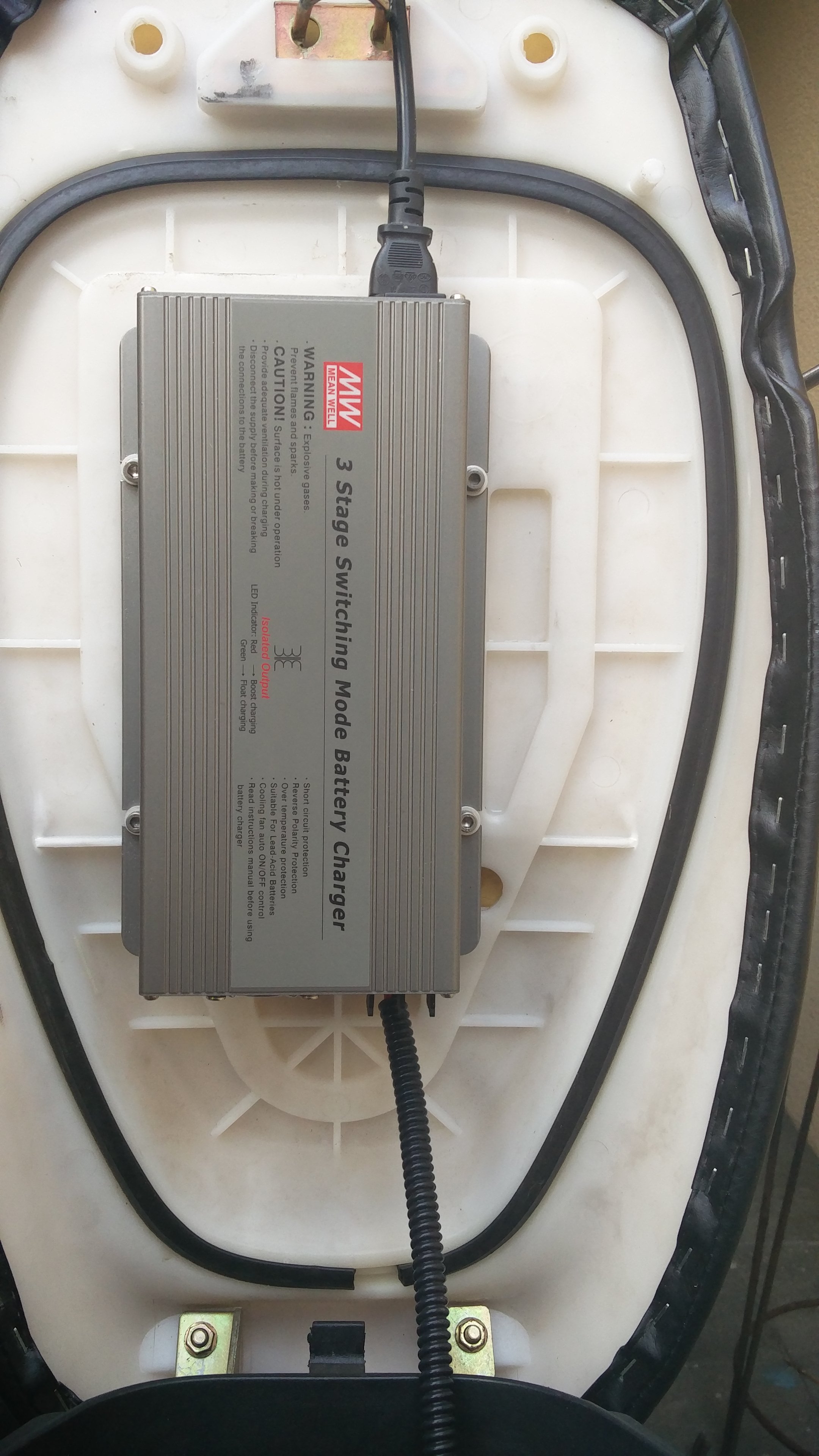 Das Helmfach ist ja eh zu klein für meinen Helm, aber dafür habe ich nun die Erlaubnis auf der Arbeit mal den Stecker in die Dose zu stecken. Von 130 Kollegen bin ich bisher der einzige mit einem Elektrofahrzeug. Also muss das Ladegerät nun mit. Alles was lose irgendwo liegt, klappert und scheppert rum. Die eigentliche Idee war das Teil eine Etage weiter unten anzubringen, aber da wohne ja schon die Balancer und so ganz trocken geht es da auch nicht zu. Der kleine Deckel hat 2 Löcher bekommen und das LG lässt sich noch ein wenig schieben um die Schraube zu lösen oder man nimmt einen neuen Kabelbinder.