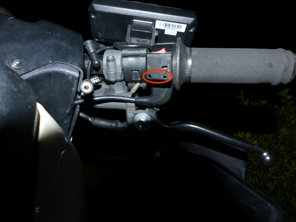 Trotzdem habe ich dem Wippschaltergehäuse unten zwei großzügige 2mm-Wasser-Ablaufbohrungen spendiert, Sicht von unten, rot umkringelt: