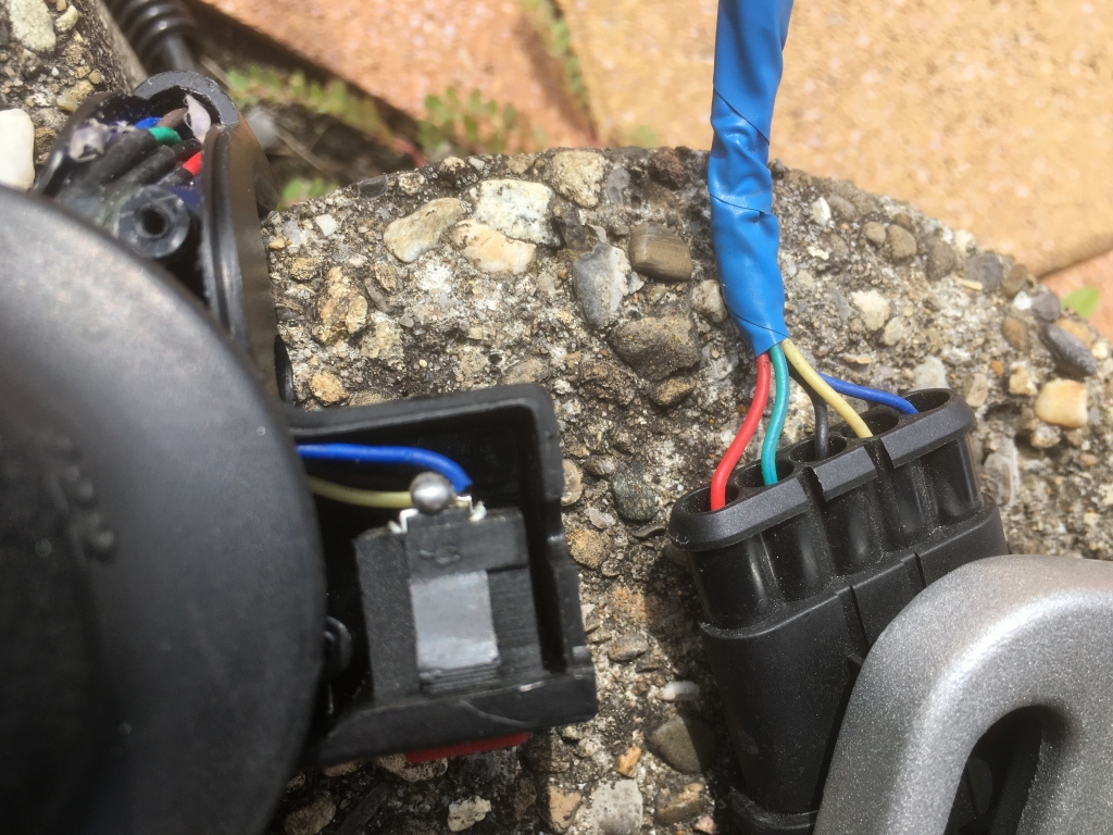 Den Fahrgriff hatte ich aber vorher schon komplett abgebaut und etwas zerlegt, um die Kabelfarben zuordnen zu können. Rot= Hall +5V, grün Hall Signal, schwarz Hall GND, gelb und blau sind die Kabel, die der Wippschalter auf Stufe I miteinander verbindet.