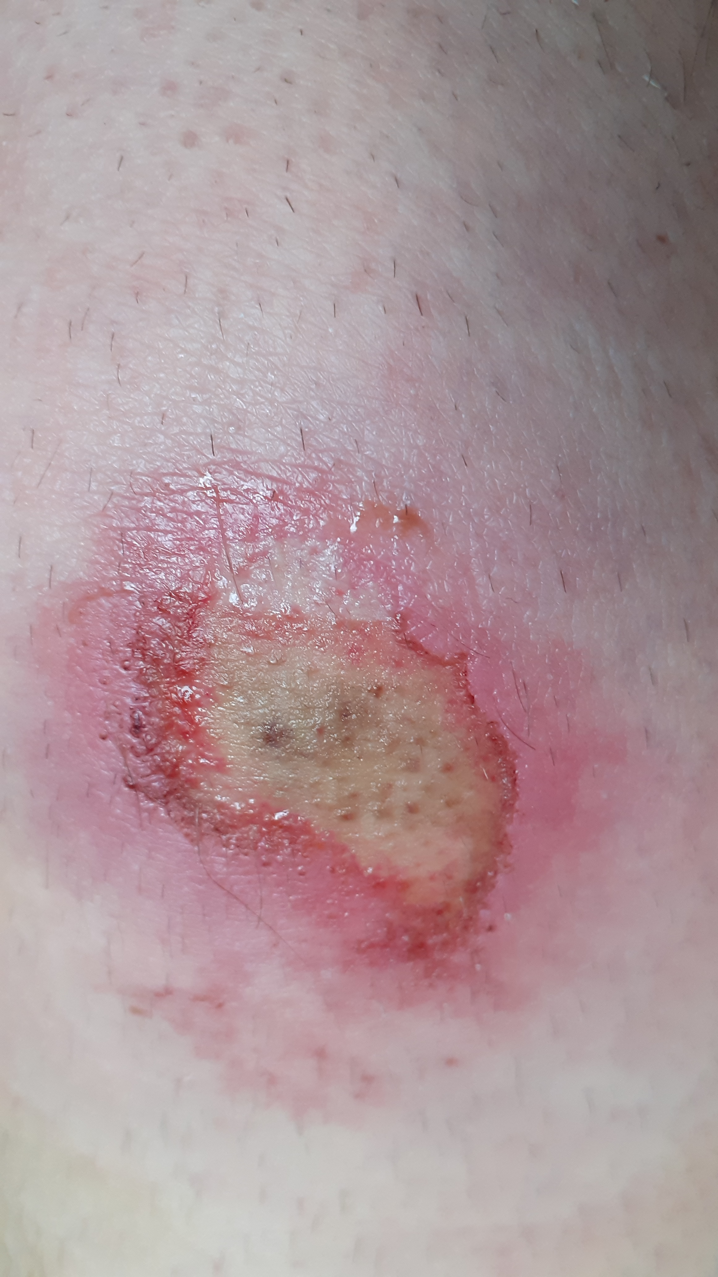 Die Folgen waren mega Prellung des rechten Knies, Bluterguss an und unter der Kniescheibe, Prelltraume der Bänder links und rechts der Kniescheibe und eine süffende offene Wunde...
