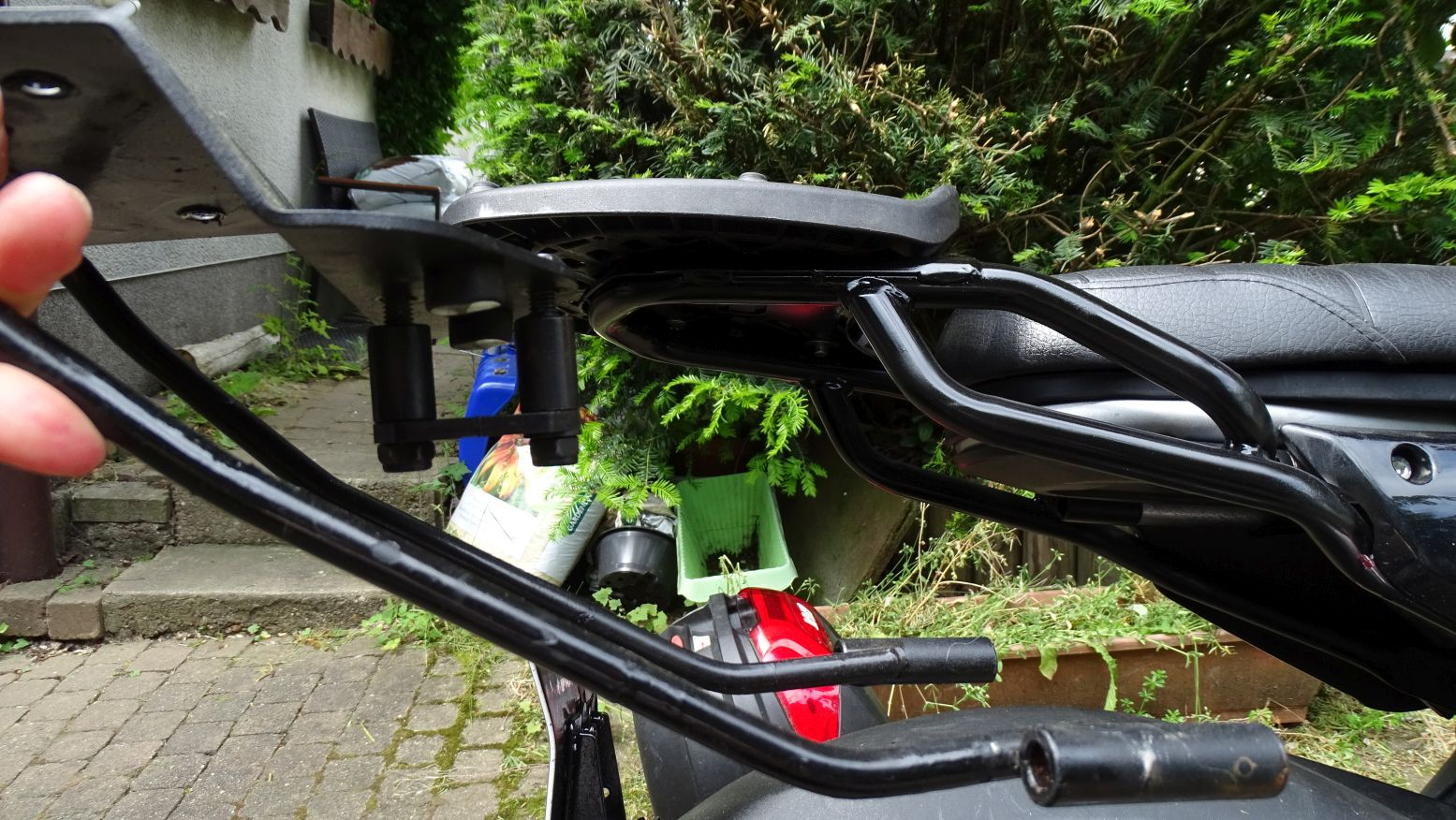 Selbst unbeladen musste ich ganz langsam über Schwellen und abgesenkte Bordsteine fahren sonst hatte ich wieder einen verbogenes Nummernschild. Mit meinen 62kg habe ich auch keinen Tiefgang auf dem Moped. Die Schrauben sind 3 mal gebrochen. Die neue Halterung ist gar kein Vergleich zu der Shad. Massiver dicker Stahl vernünftig an 4 Punkten befestigt. Hätte gleich diesen nehmen sollen.