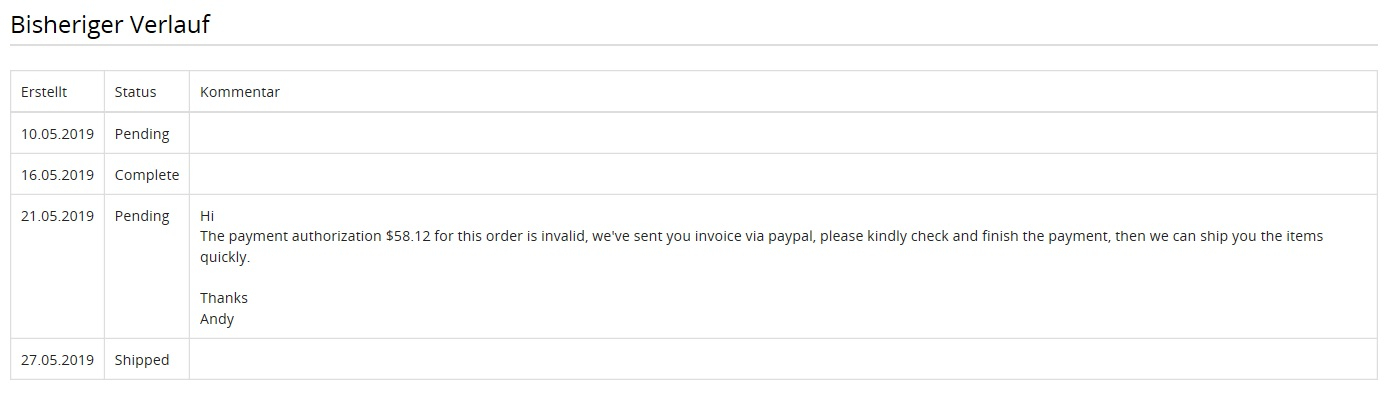 Am 16.05.2019 änderte sich mein Bestellstatus von „Pending“ in „Complete“, damit war für mich die Sache erledigt und ich wartete eigentlich nur noch auf die Information, dass meine Bestellung in den Versand geht bzw. auf die Sende-ID.