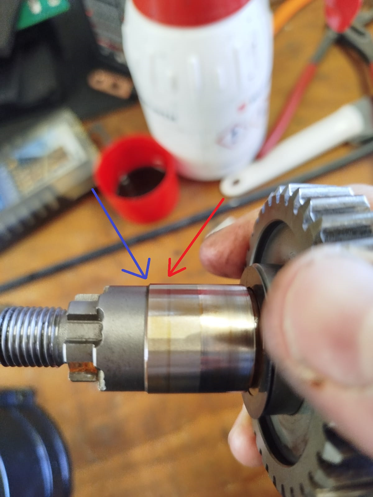 Der Wellendichtring hat zwei Lippen. Die eine Lippe (roter Pfeil) hat eine Spur hinterlassen auf der Welle (ganz normal), der blaue Pfeil zeigt da wo zweite Lippe einen Abdruck hätte hinterlassen müssen. Hat Sie aber nicht, weil die Welle an der Stelle dünner ist.