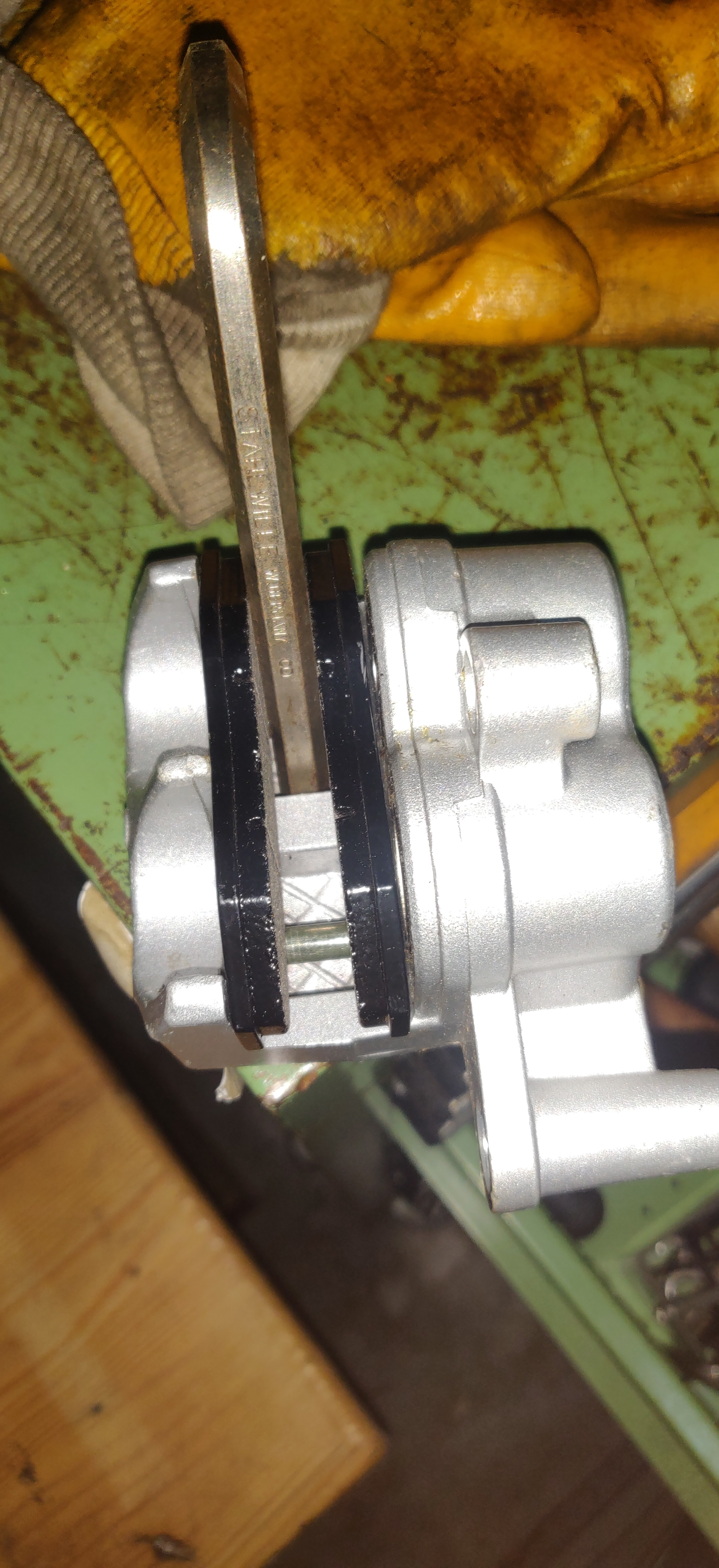 Rein vom Messen würde auch 9 mm passen. Sattel ist ganz drin, Scheibe hat 4,5 mm, der Schlüssel ist 8 mm.