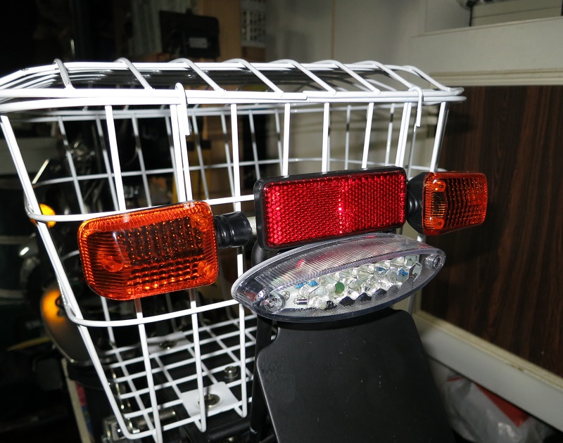 Vorne die seitlichen Reflektoren abschrauben und am Korb wieder anschrauben. Die freigewordenen Löcher aufbohren und die Blinker anschrauben. Für die Kabelführung ein Stück vom Aluminiumrohr dazwischen setzen.