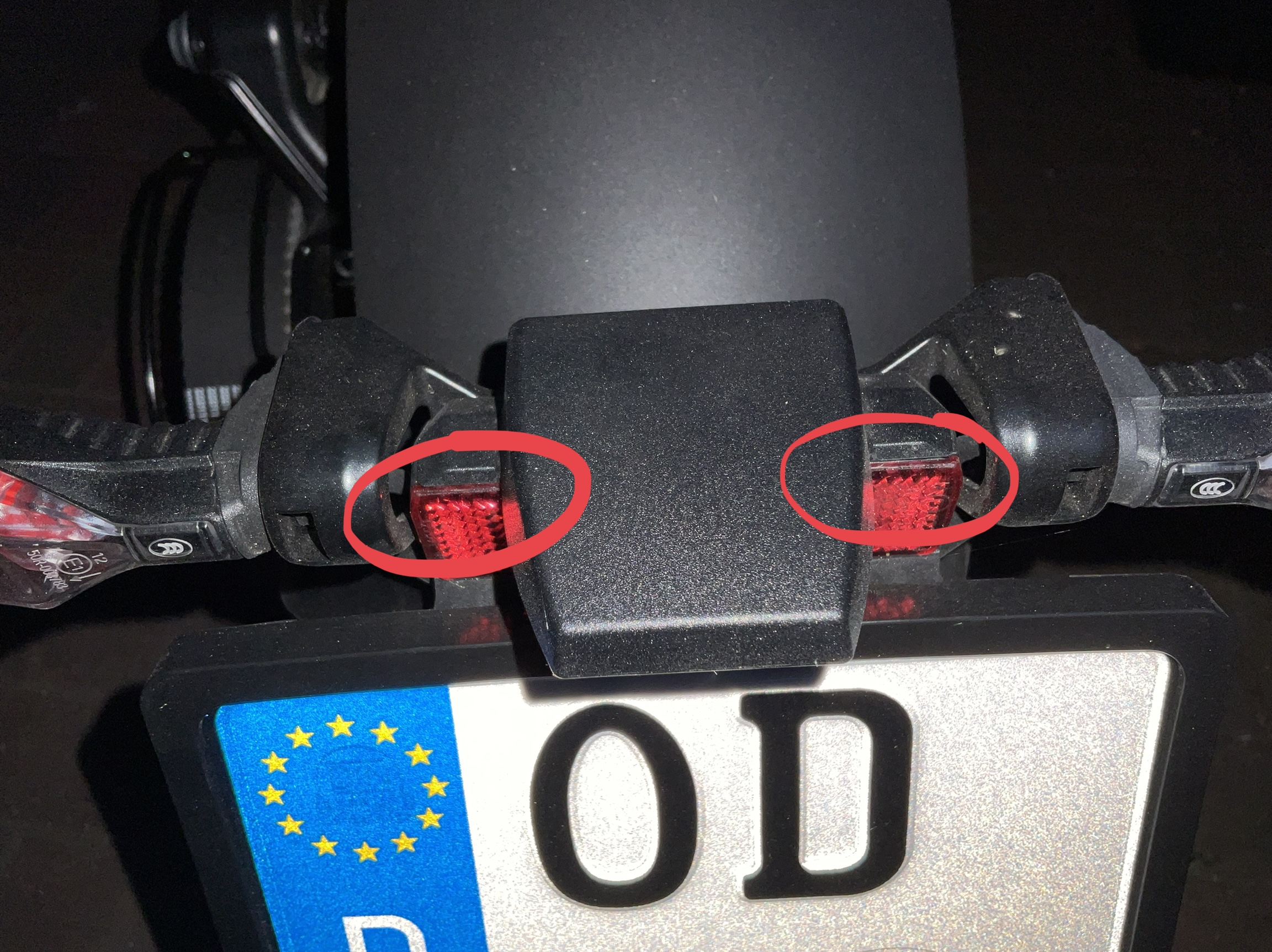 schwarze LED Abdeckung der Kennzeichenleuchte, oberhalb des roten Katzenauges, provisorisch einen Holzsplitter zwischen Abdeckung und Katzenauge rein gesteckt