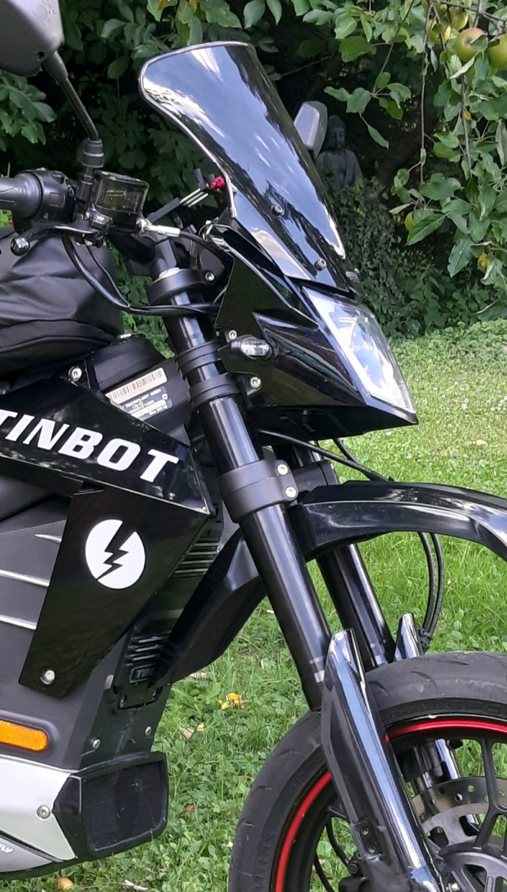 Den kleinen Spoiler unterhalb des Controllers hinter dem Vorderrad habe ich ausgeschnitten und mit einem Gitter versehen. Jetzt streift mehr Luft zwischen Verkleidung und Batteriebox zum Motor. Dann noch ein kleineres Schutz(blech) angebracht mit Luftschlitzen zur Kühlung des Controllers.