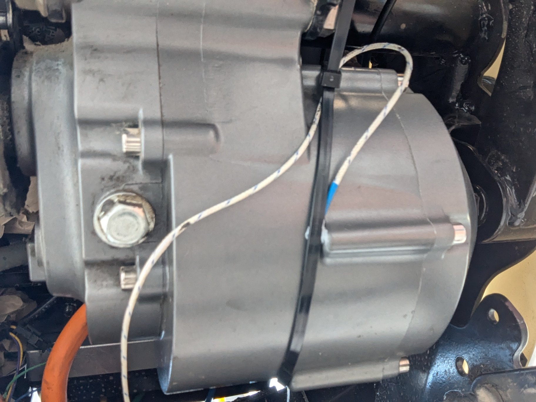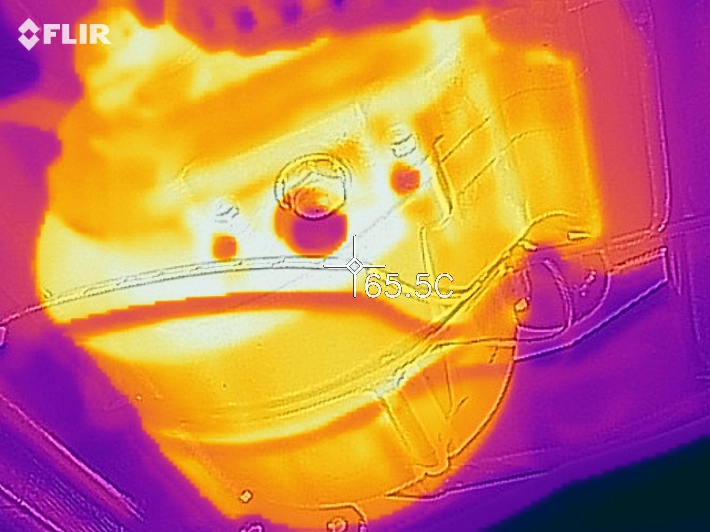 Halbzeit nach der sehr starken Steigung: vom Bock unter gesprungnen - kein Piep, keine LED, 51°C am Sensor, nach 3min Standzeit auf 55°C angestiegen. Auf Rückweg noch 2x nach Steigung angehalten & Check: keine Meldung. So auch wie bei finaler Ankunft zu Hause: kein Piep, keine LED, 63°C am Sensor. Schnell noch die FLIR Kamera drauf gehalten: Sensordaten bestätigt, Wärmeverteilung recht homogen. Getriebe mit 2°C leicht wärmer alles völlig unkritsch. Innnen in der Wicklung dürften es 10..20K mehr sein, auch das völlig easy.