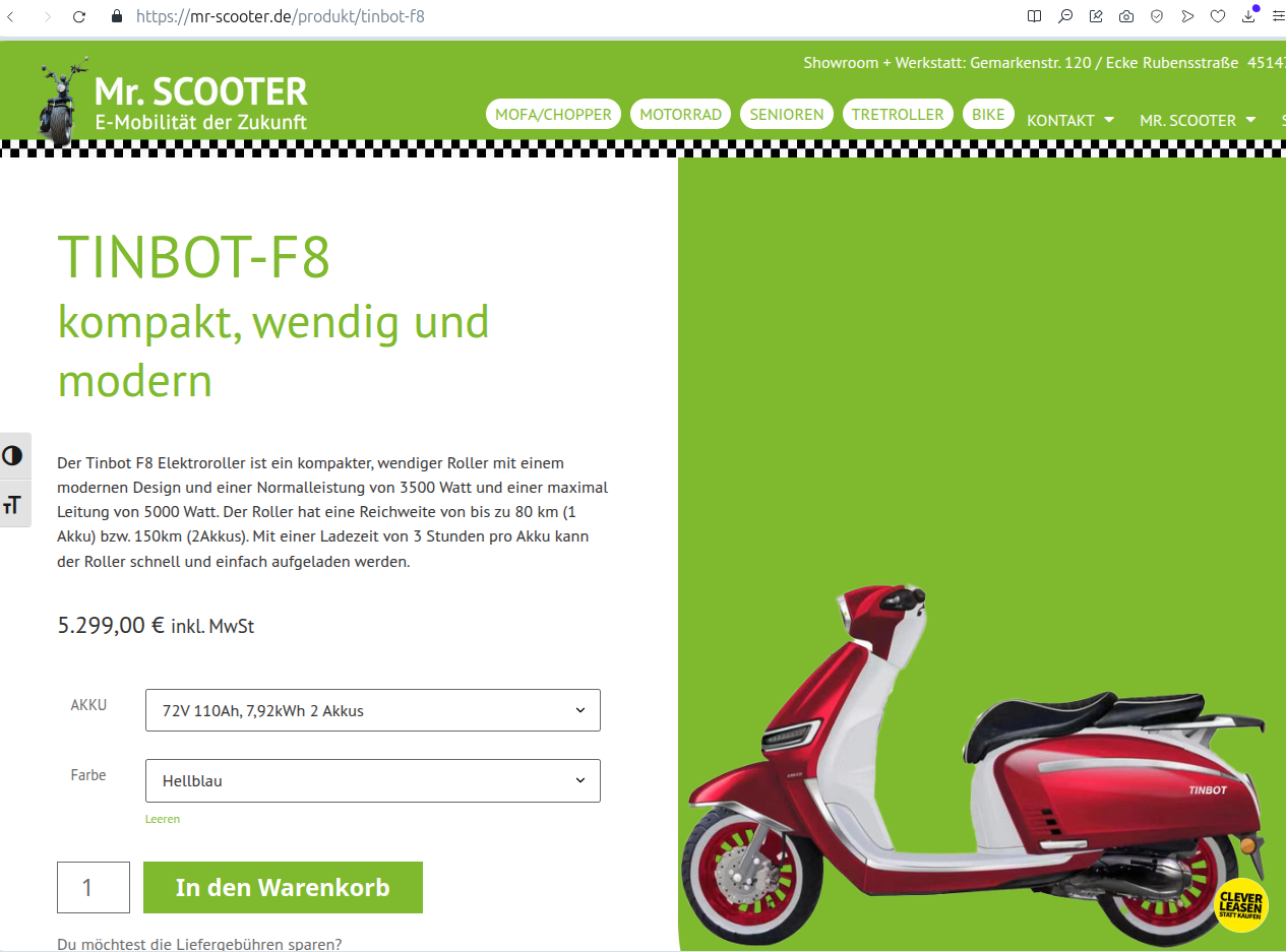 Also, ich würde mir für weniger Geld da entweder den Tinbot F8 oder baugleichen Next Mojito kaufen. Vorteil von dem: satte 8 kWh Akkukapazität und mit 5.300 € (allerdings ohne Fracht) trotzdem noch günstiger als der Berlin.