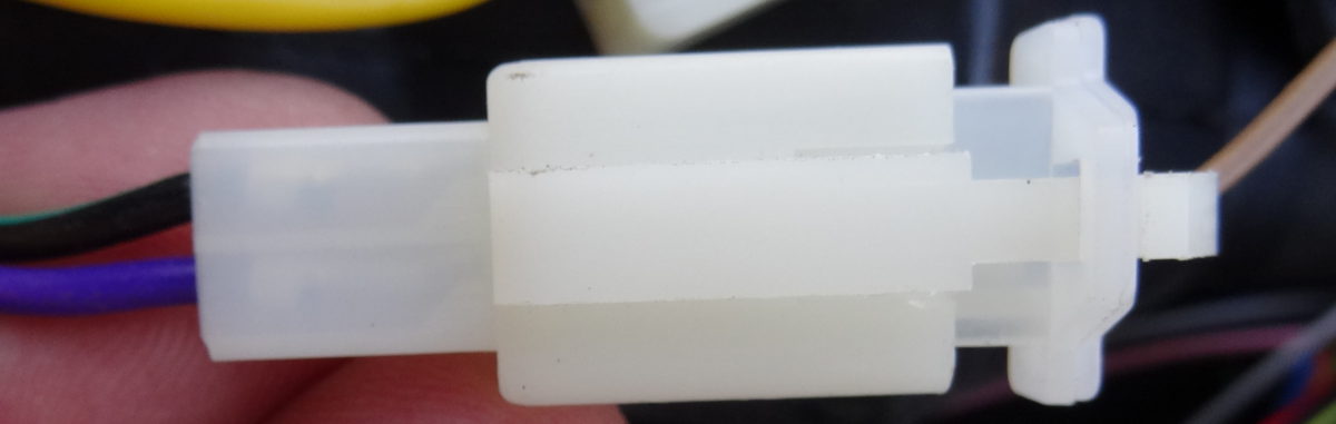 Schwarzer Flachstecker, war bei mir auf Höhe der rechten Blinkers von unten/aussen aus der Radmulde zugreifbar (damit man nicht immer den Sitz abbauen muss.