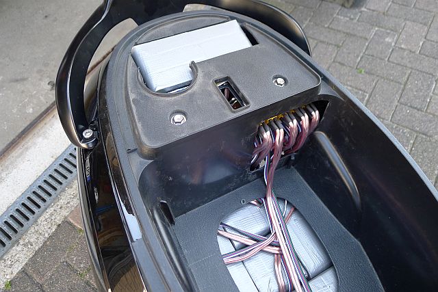 Ich habe aber noch vor dem unterem Akkufach unter der Trittfläche einen zusätzlichen Akkukasten eingebaut der drei 40Zeller aufnimmt. So habe ich noch das gesamte Helmfach frei. Für den Anschluss der Akkus und der Ballancerstecker habe ich noch ein Anschlussterminal mit Steckverbindungen eingebaut.