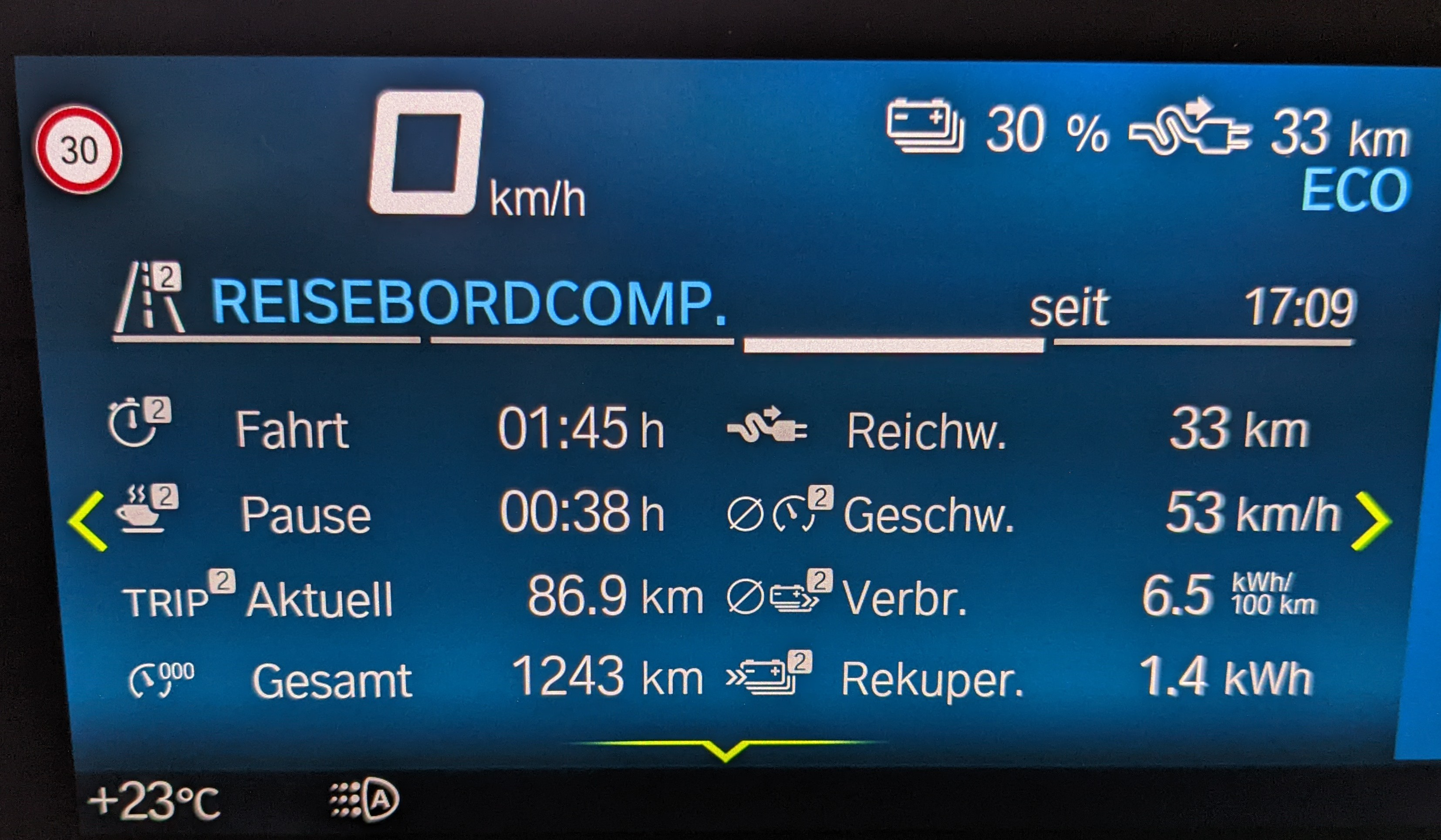 Vor dieser Runde hatte ich vollgeladen. Fahrweise normal effizient mit schnellen Landstraßenstücken und wechselhaft, aber alles Eco. Ich kann wohl mit an die 120km rechnen, wenns sein müsste.