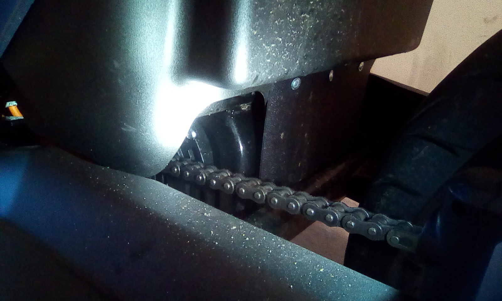 Abstand zwischen der einen Schwinge bis fast zur Kette gemessen, zugeschnitten und mit 3 kurzen Schrauben an der kleinen, ca. 2cm kurzen Lippe oberhalb des Motors befestigt (s.Fotos).