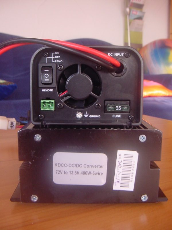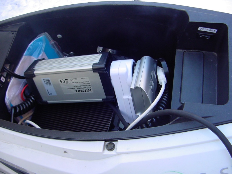 Unten ist der fette Kelly 72V-13,5V 400W DC-DC-Wandler. Oben drauf steht der "Voltcraft" (Conrad) NPI 300-12 300W Wechselrichter / Inverter. Beides kommt aus China.