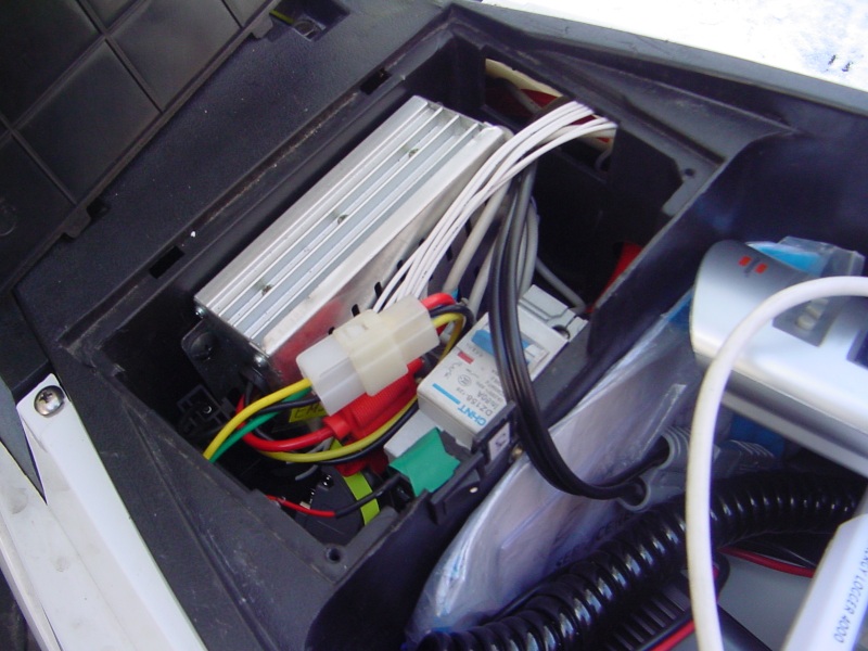 Aus der rechten Öffnung (am oberen Bildrand) kommt jetzt, neben den weißen RS232-Kabeln von Controller und BMS, auch das 72V-Auxkabel, das oberhalb des Sicherungsautomats ins Helmfach gelangt und mit einem Anderson SB50 Stecker endet. In diesem Bild ist der Gegenstecker zum Wandler schon eingesteckt.